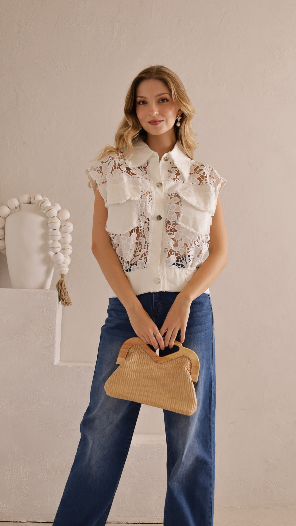 Style: Sleeveless button-up blouse with lace paneling