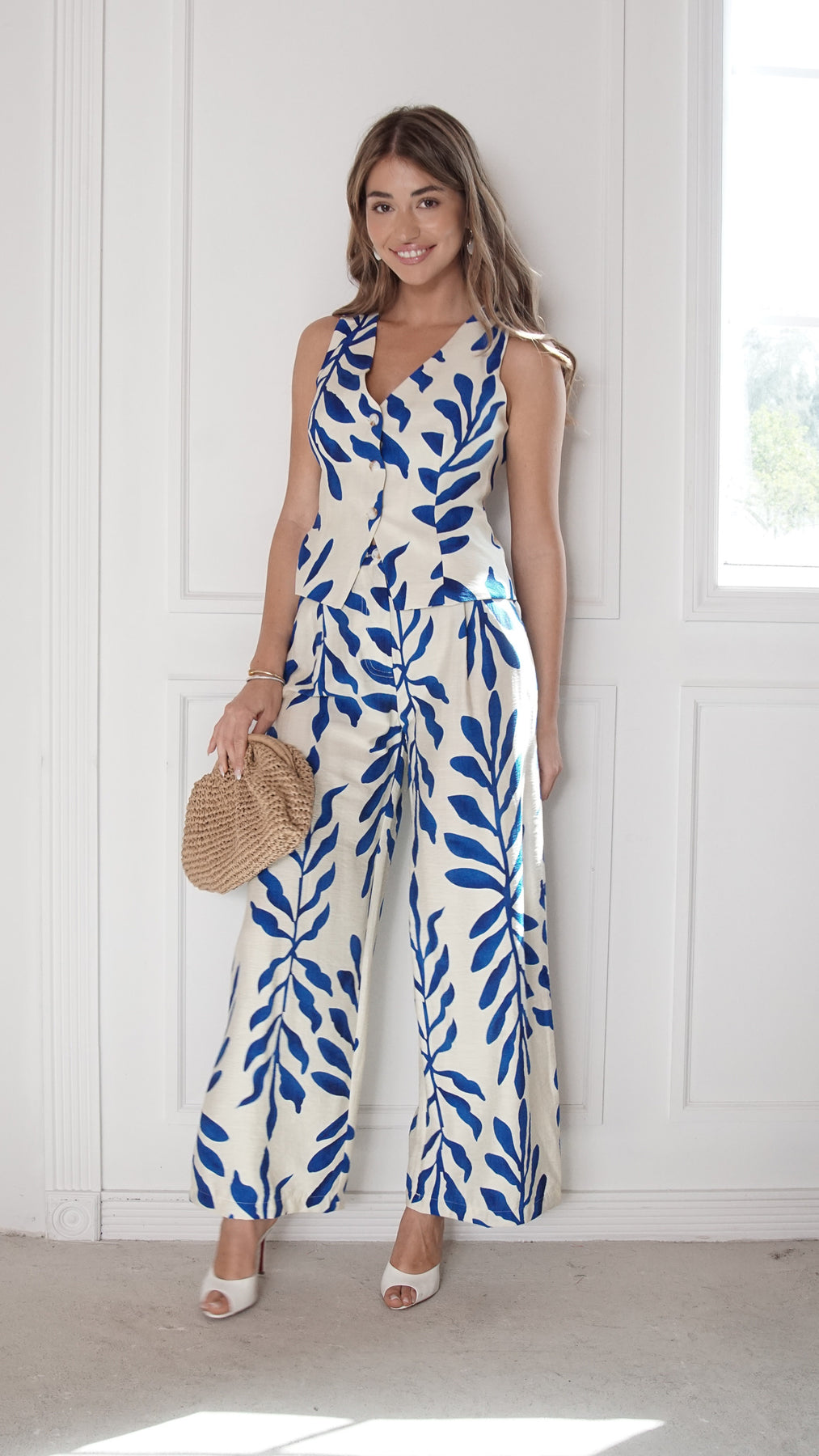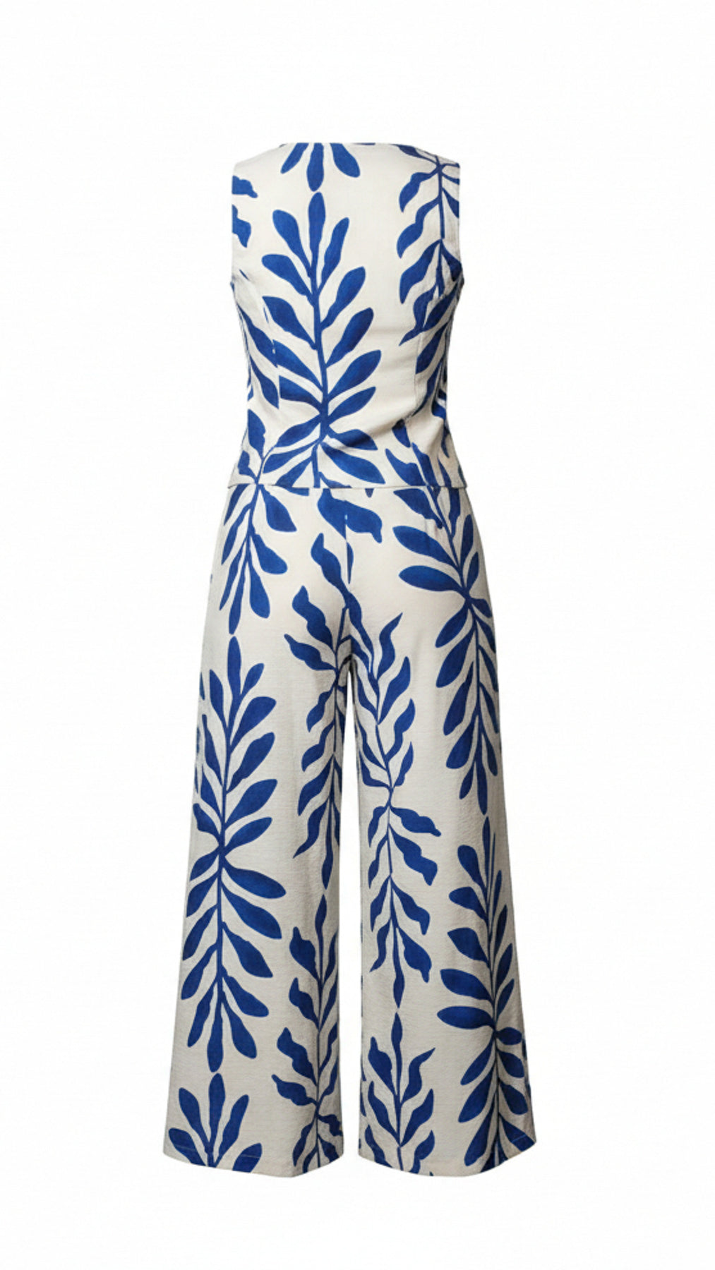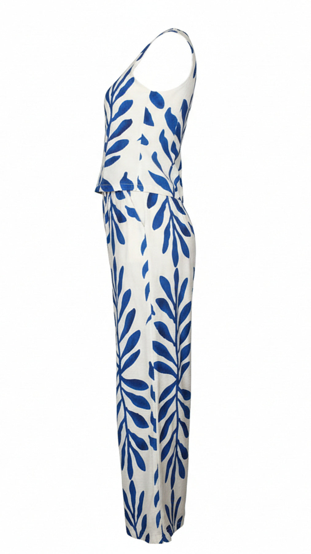 Style: Two-piece sleeveless crop top with contrast piping and matching high-rise wide leg pants with tie waist