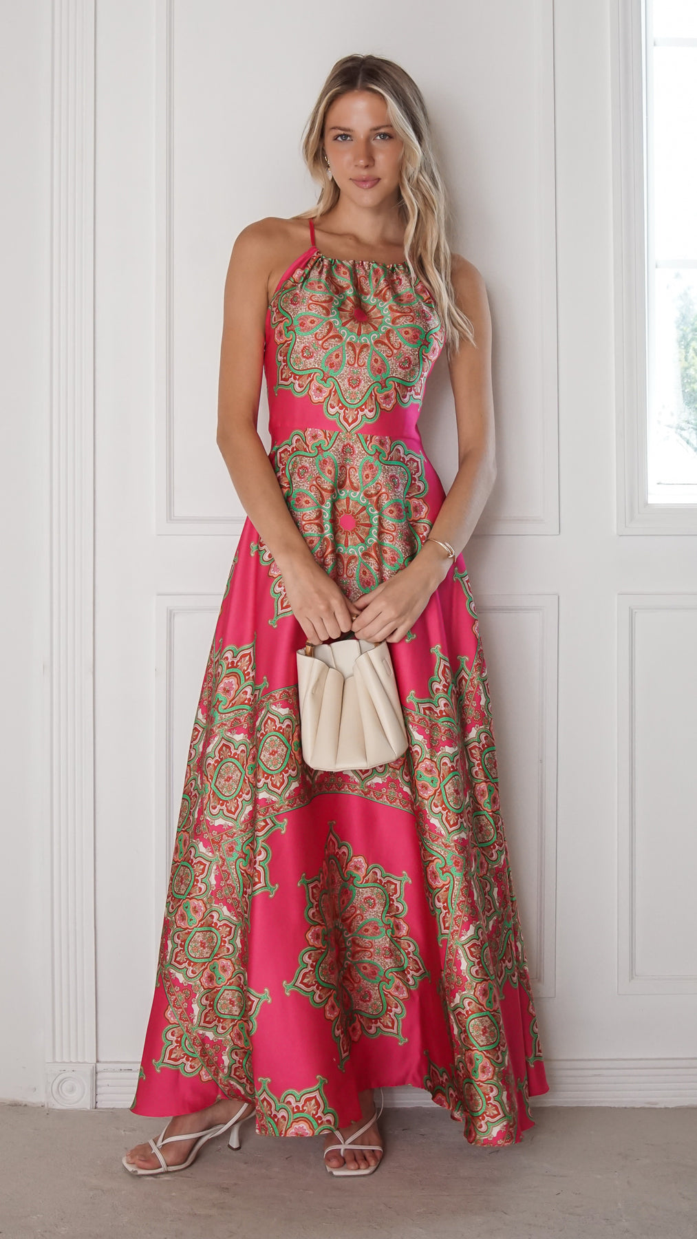 Style: Elegant halter maxi dress featuring an intricate baroque-inspired print and a softly flared skirt for graceful movement.