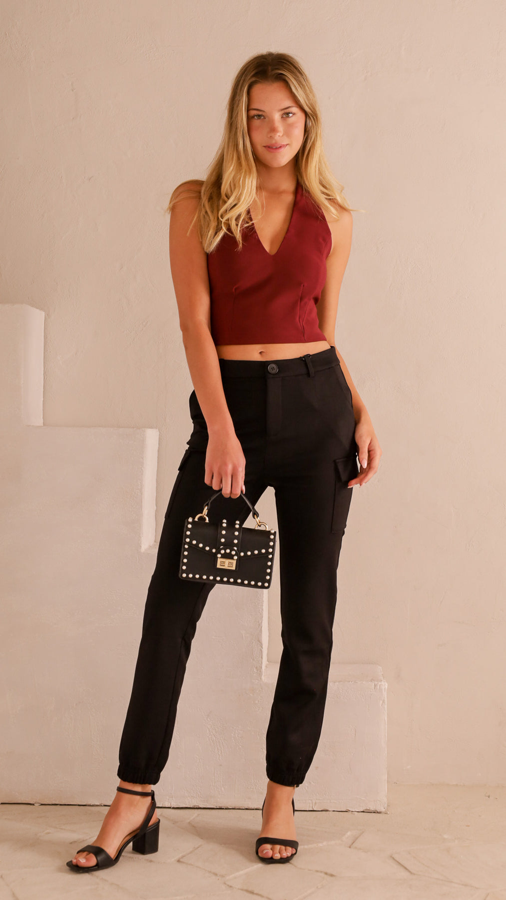 Style: Sleeveless cropped top with a fitted silhouette and dart seam detailing