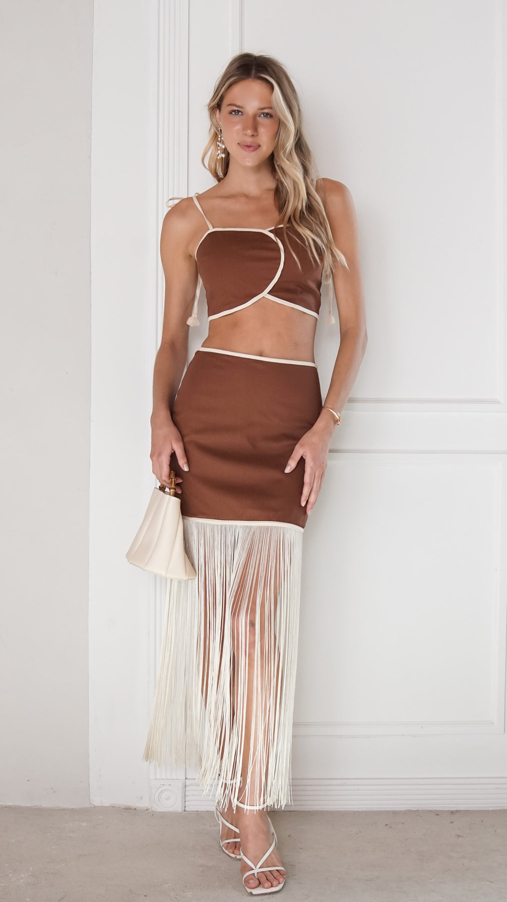 Style: Two-piece crop top and midi skirt set with contrast trim and dramatic fringe hem detail.