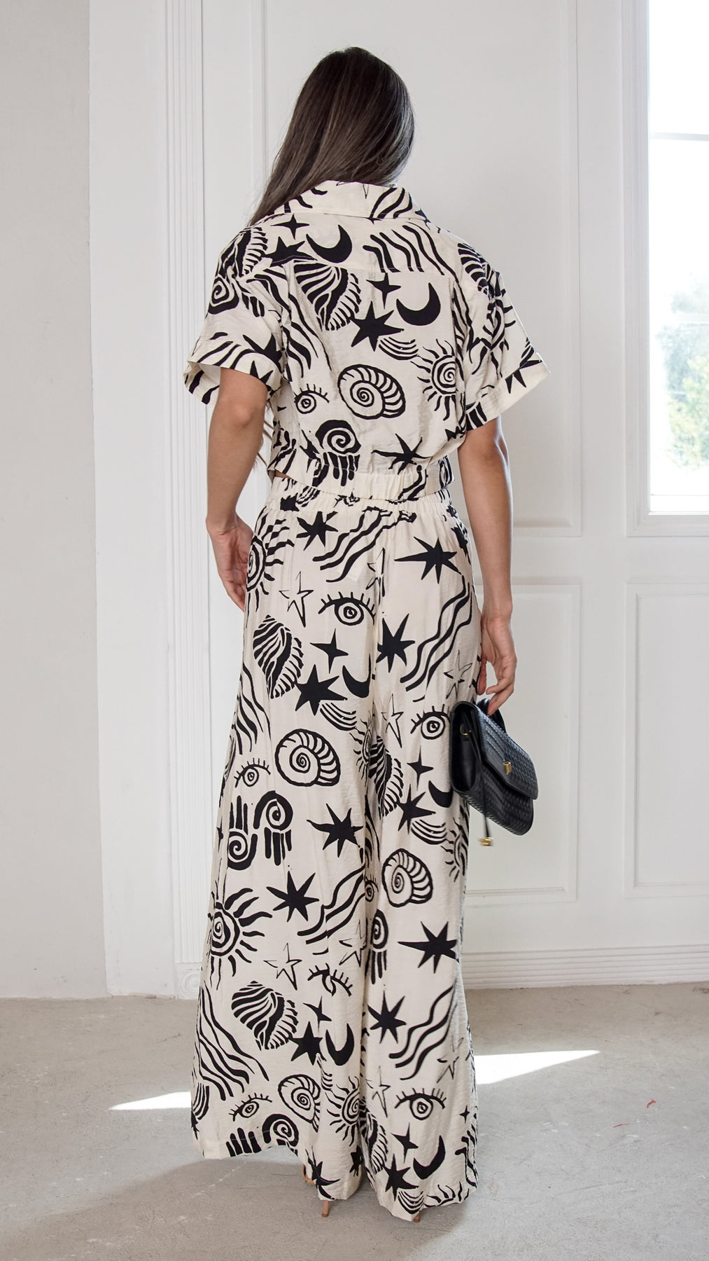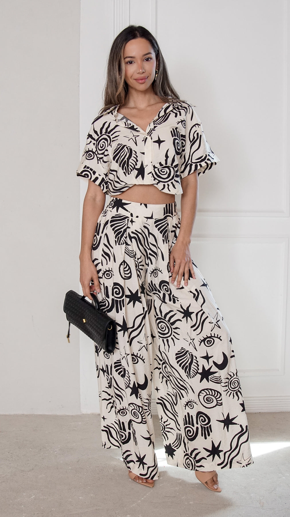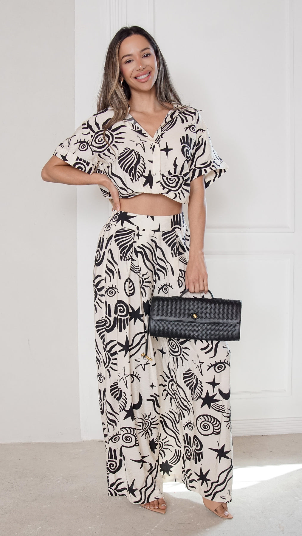 Style: High-waisted palazzo pants with bold celestial-inspired print.