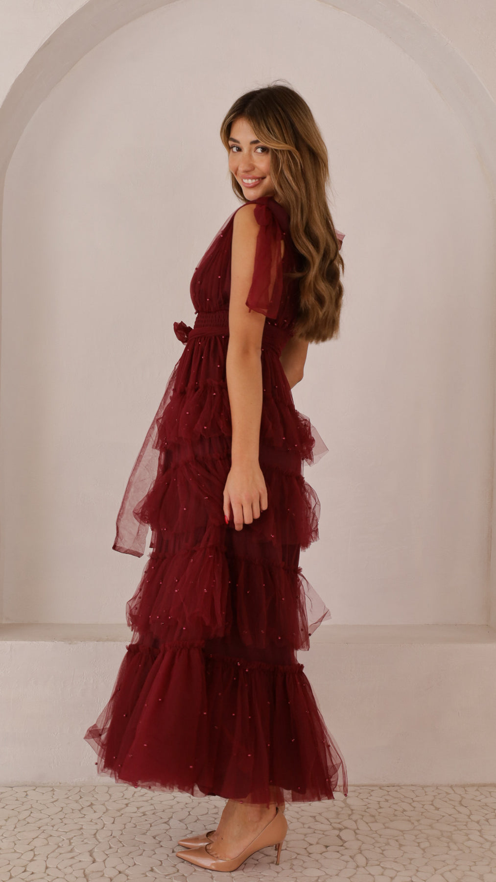Style: Tiered tulle maxi silhouette with delicate sparkle detailing