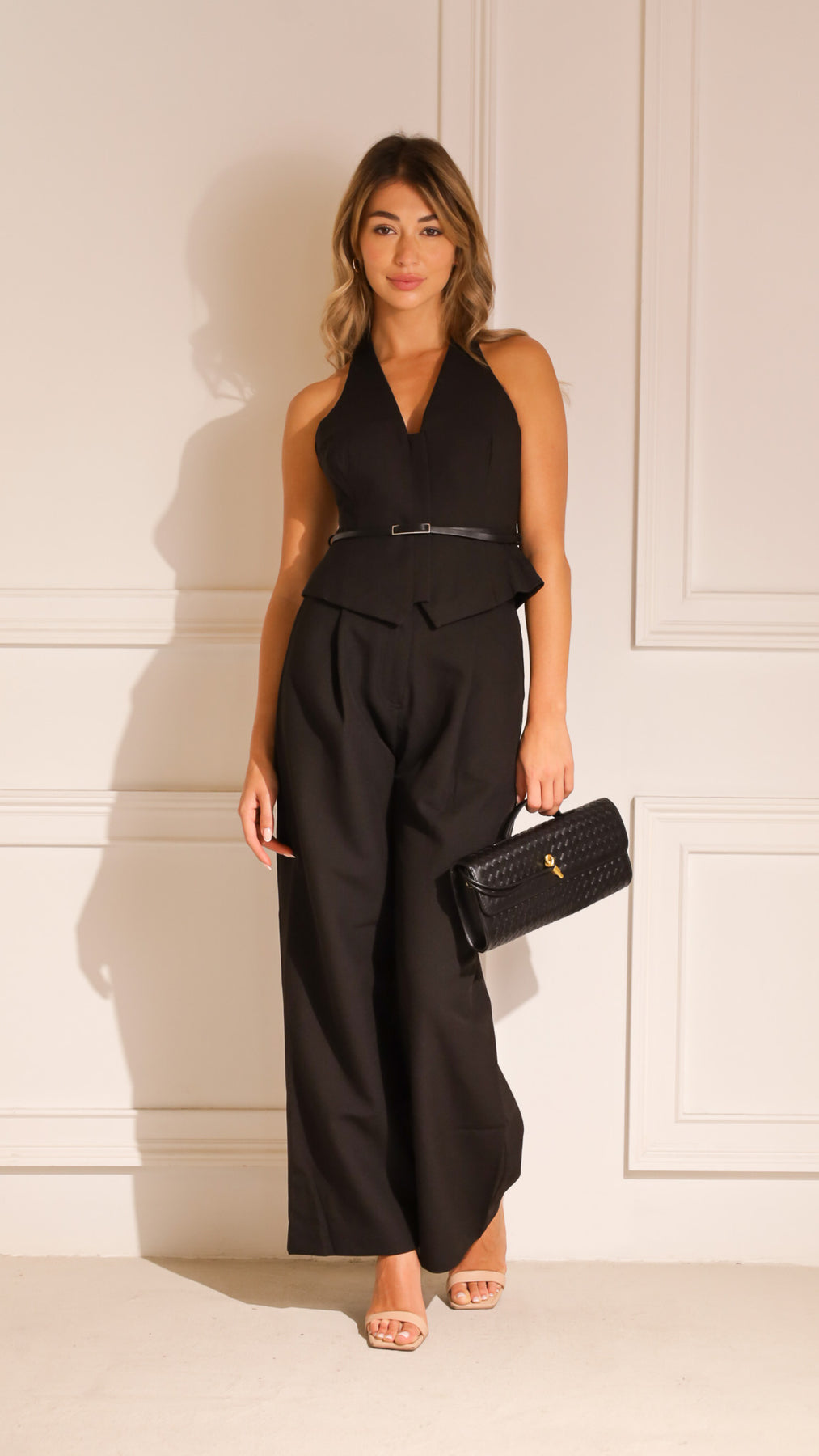 Style: Two-piece halter peplum top and wide-leg pants