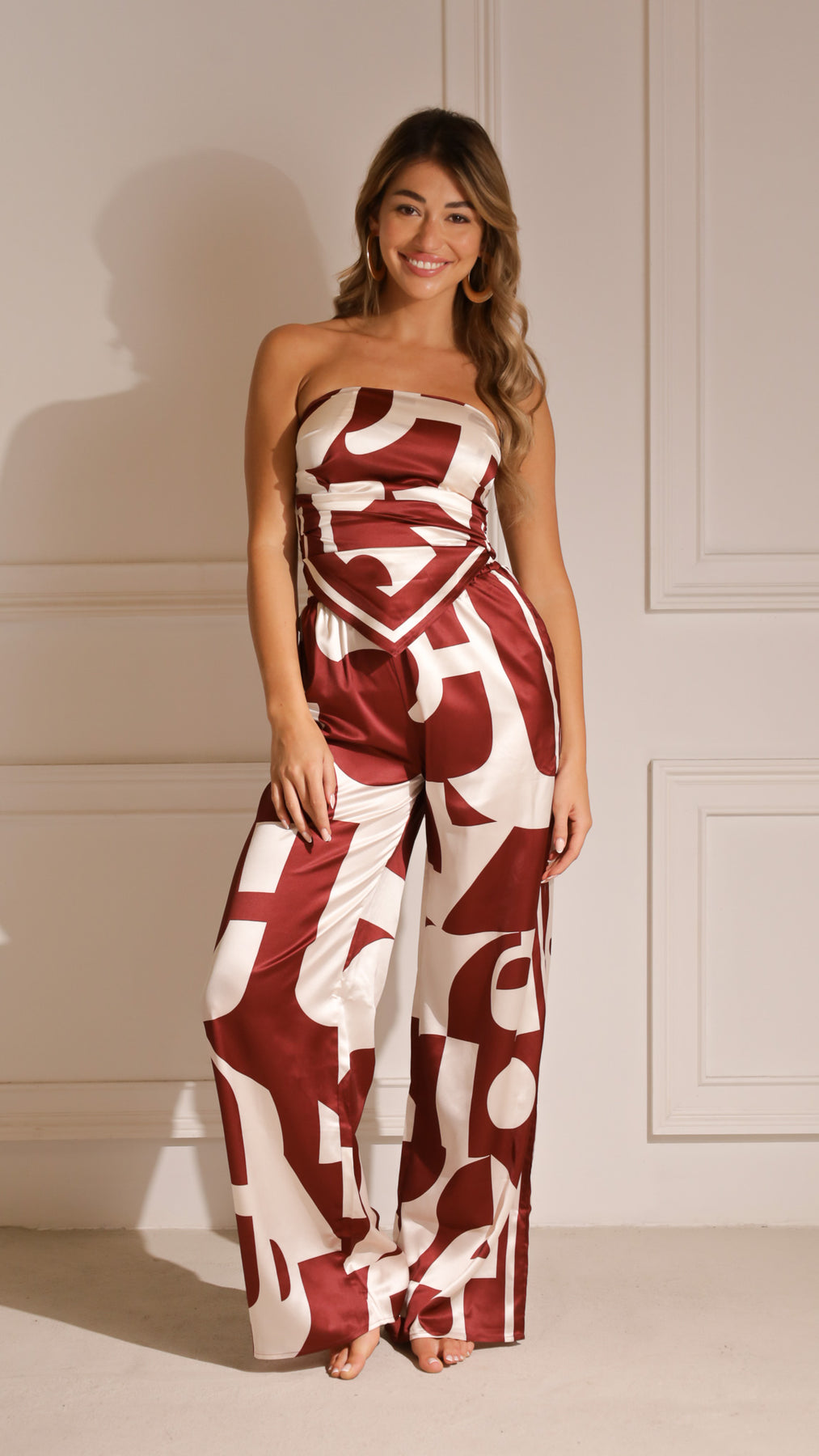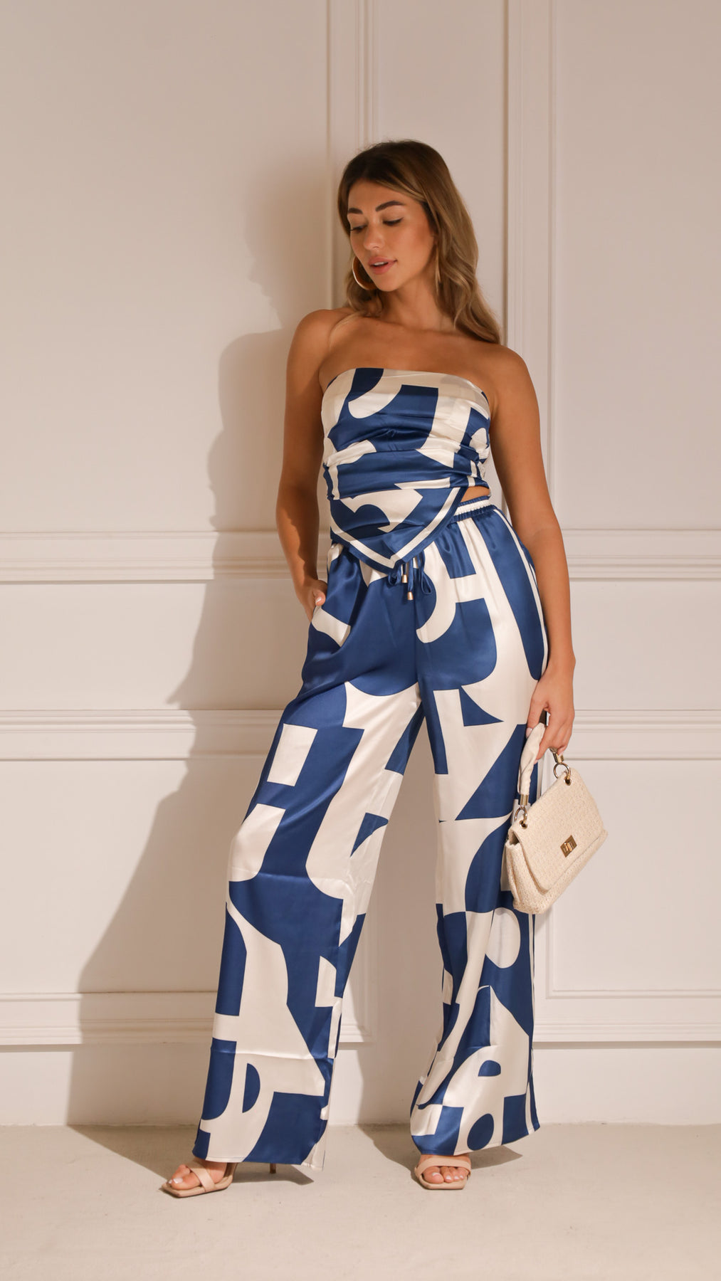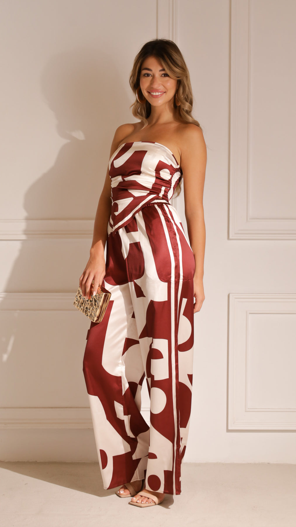 Style: Two-piece strapless set with draped top and wide-leg pants