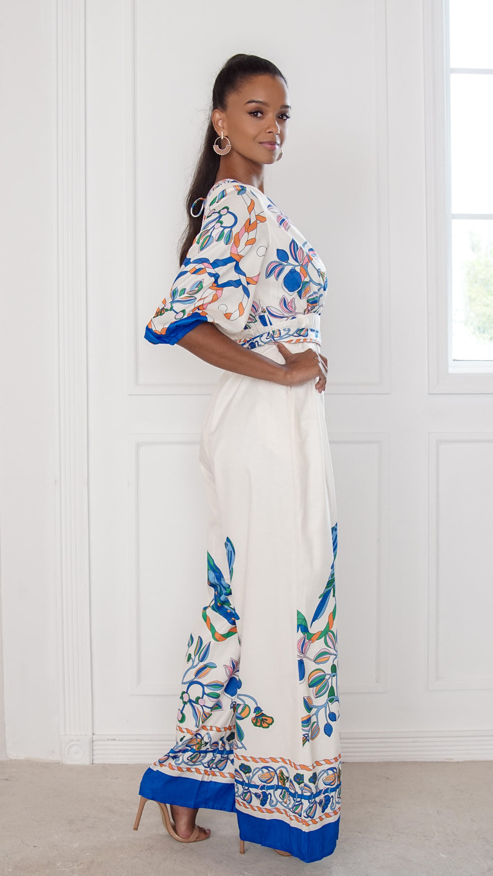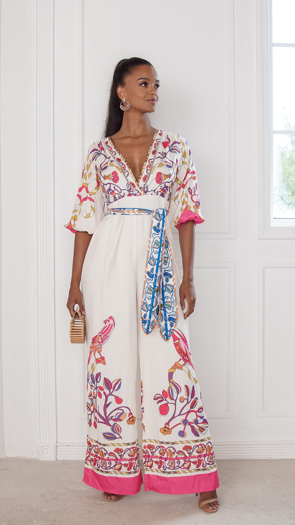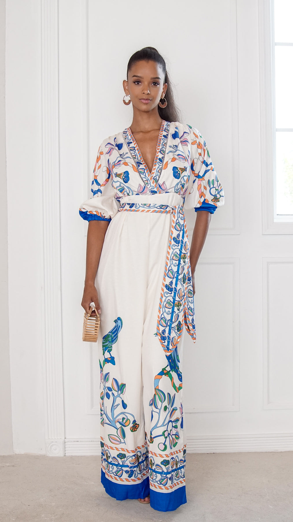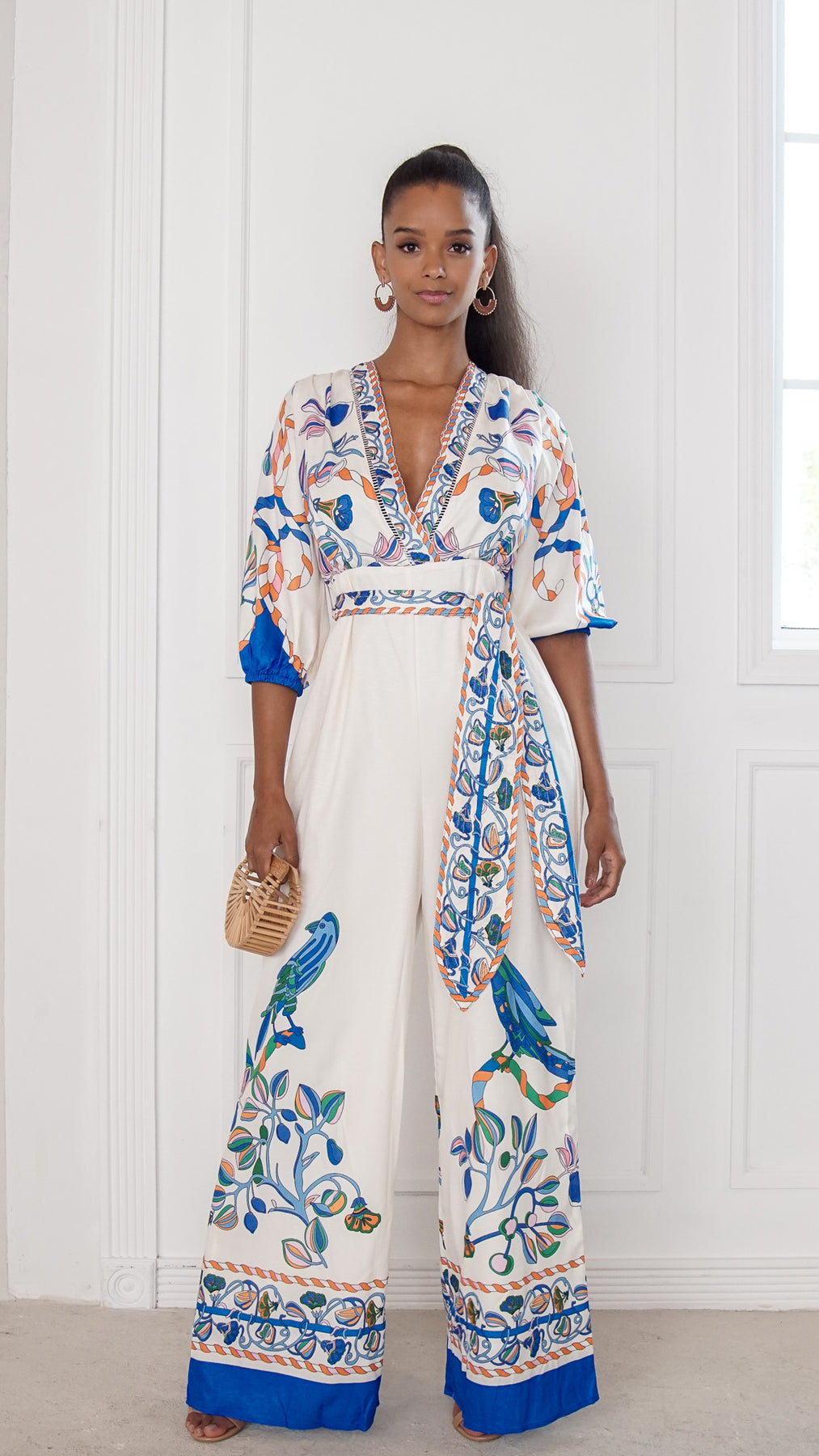 Style: printed wide-leg jumpsuit with wrap-style bodice, decorative border details, and adjustable waist tie