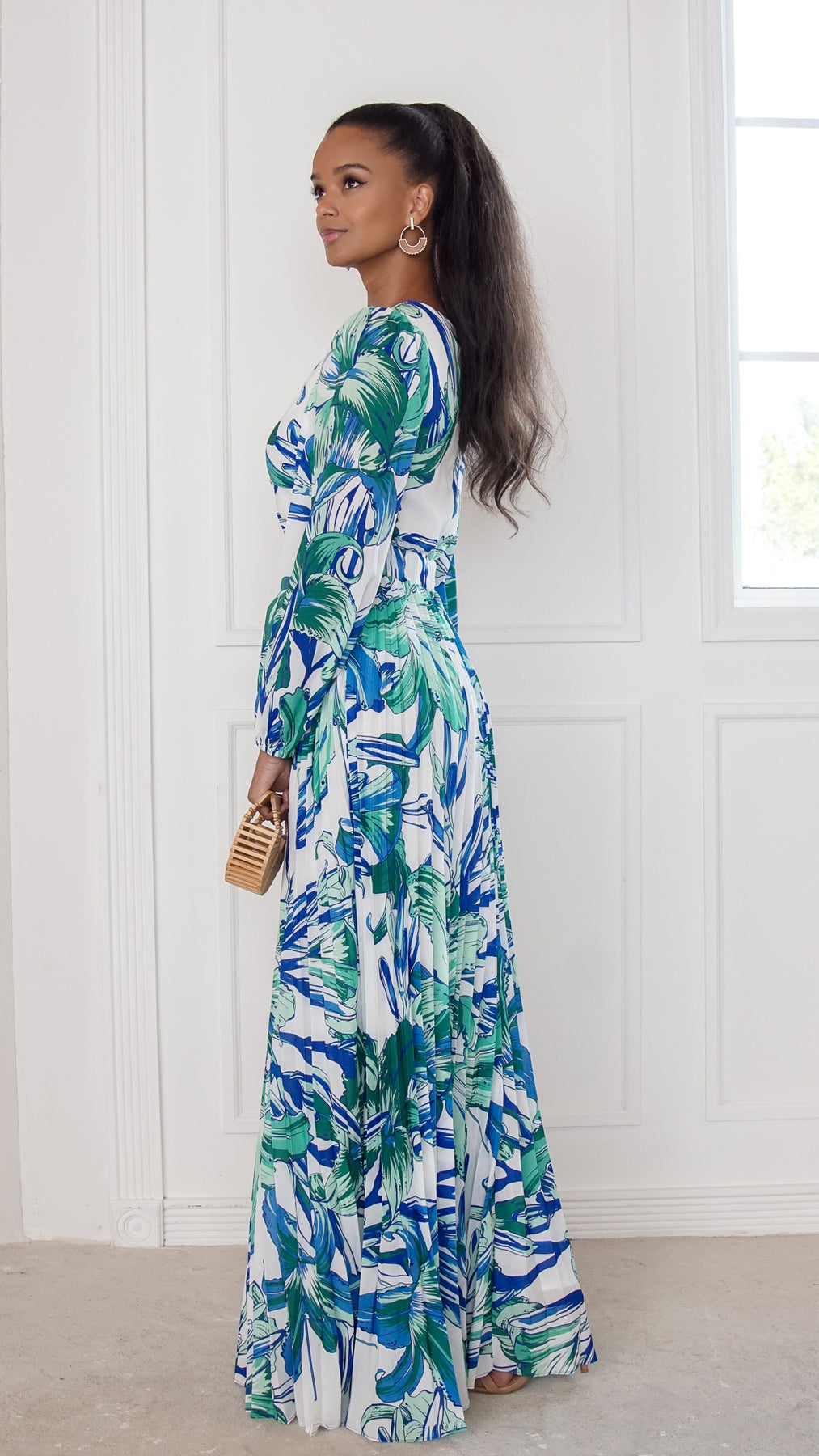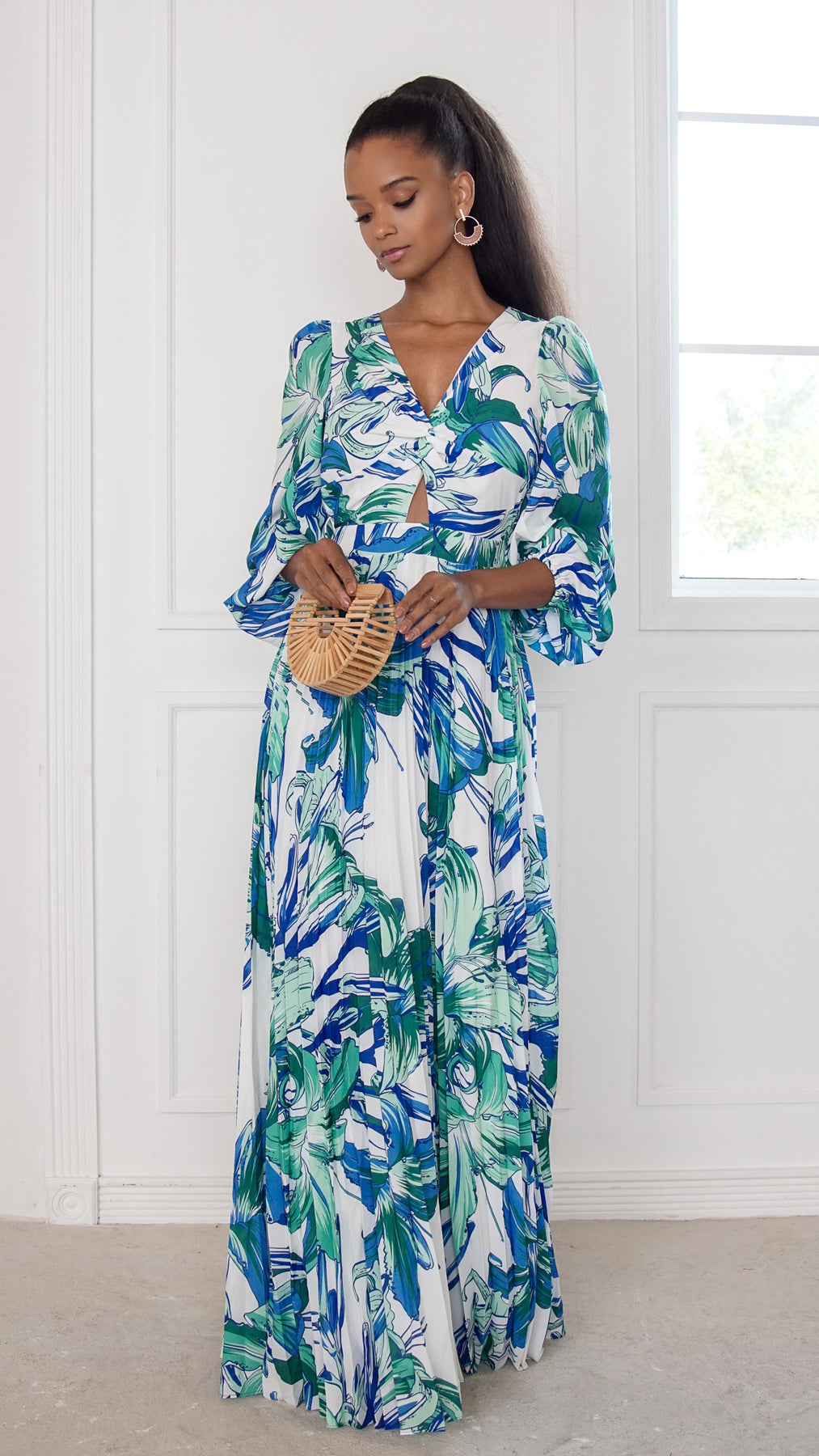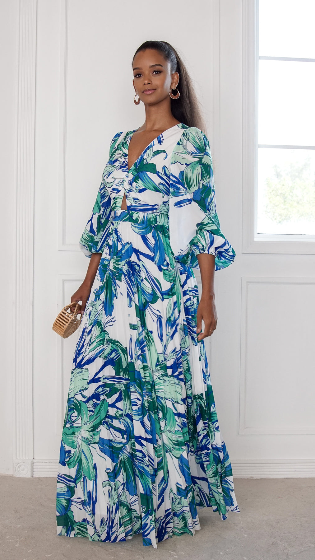 Style: tropical print maxi dress with twist-front bodice, waist cutout detail, and flowing skirt