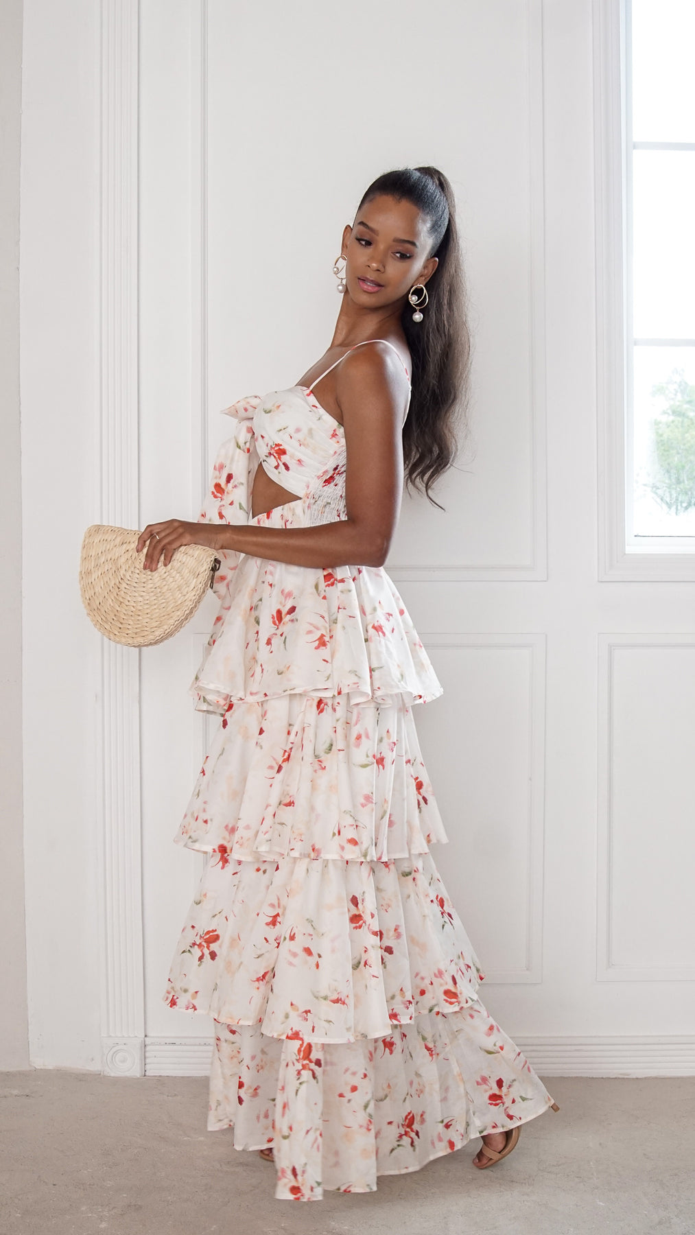 Style: tiered floral maxi dress with front tie bow detail and waist cutout