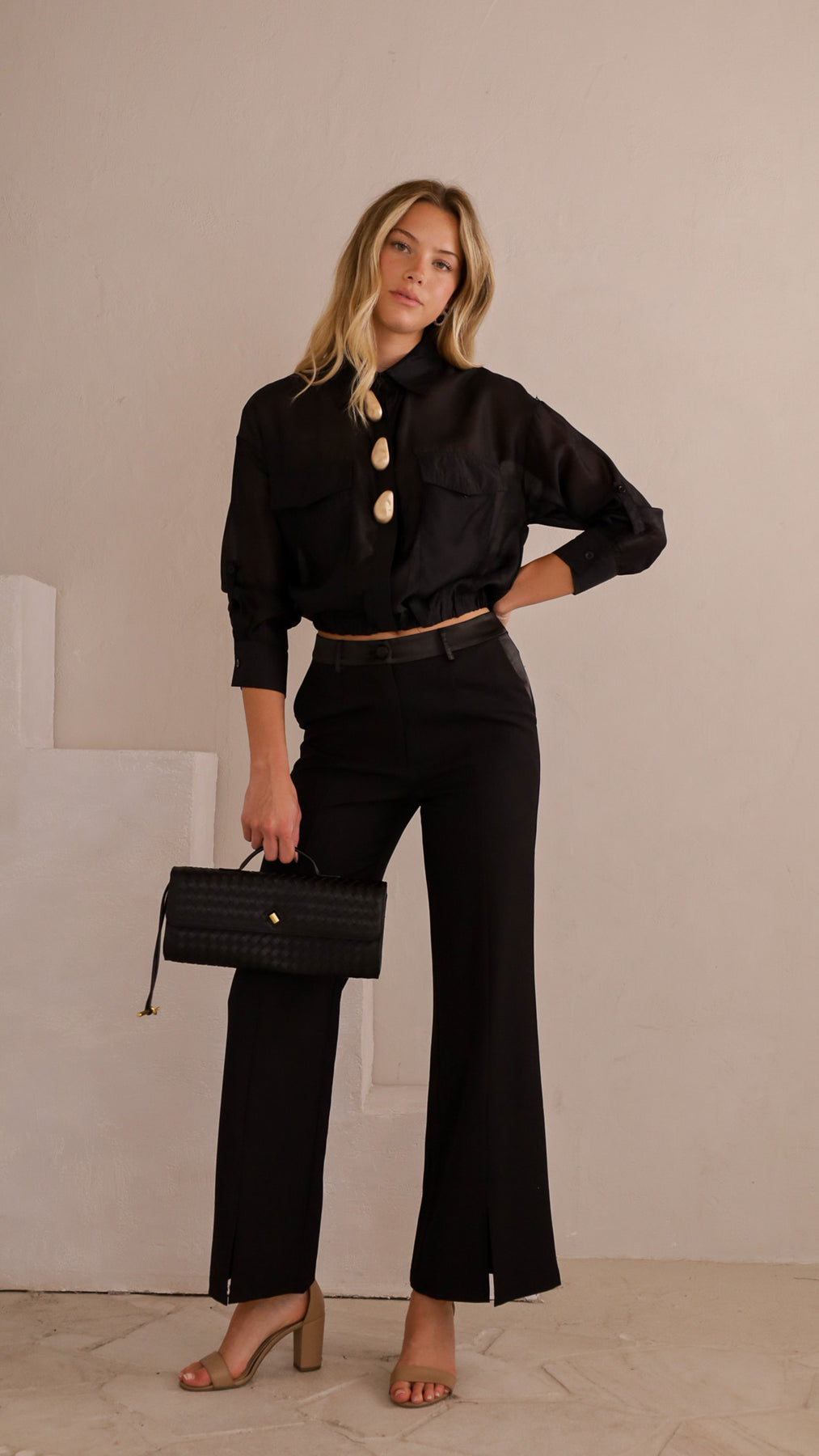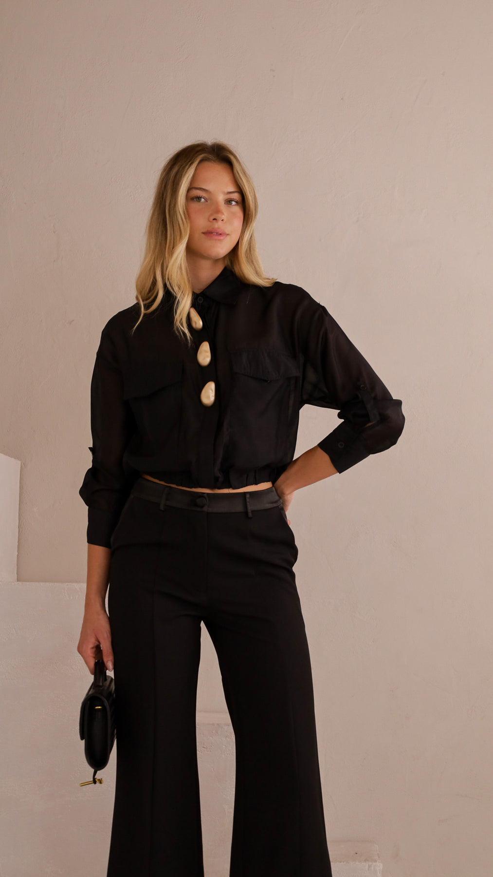 Style: Lightweight sheer button-up blouse with rolled sleeves and front pockets