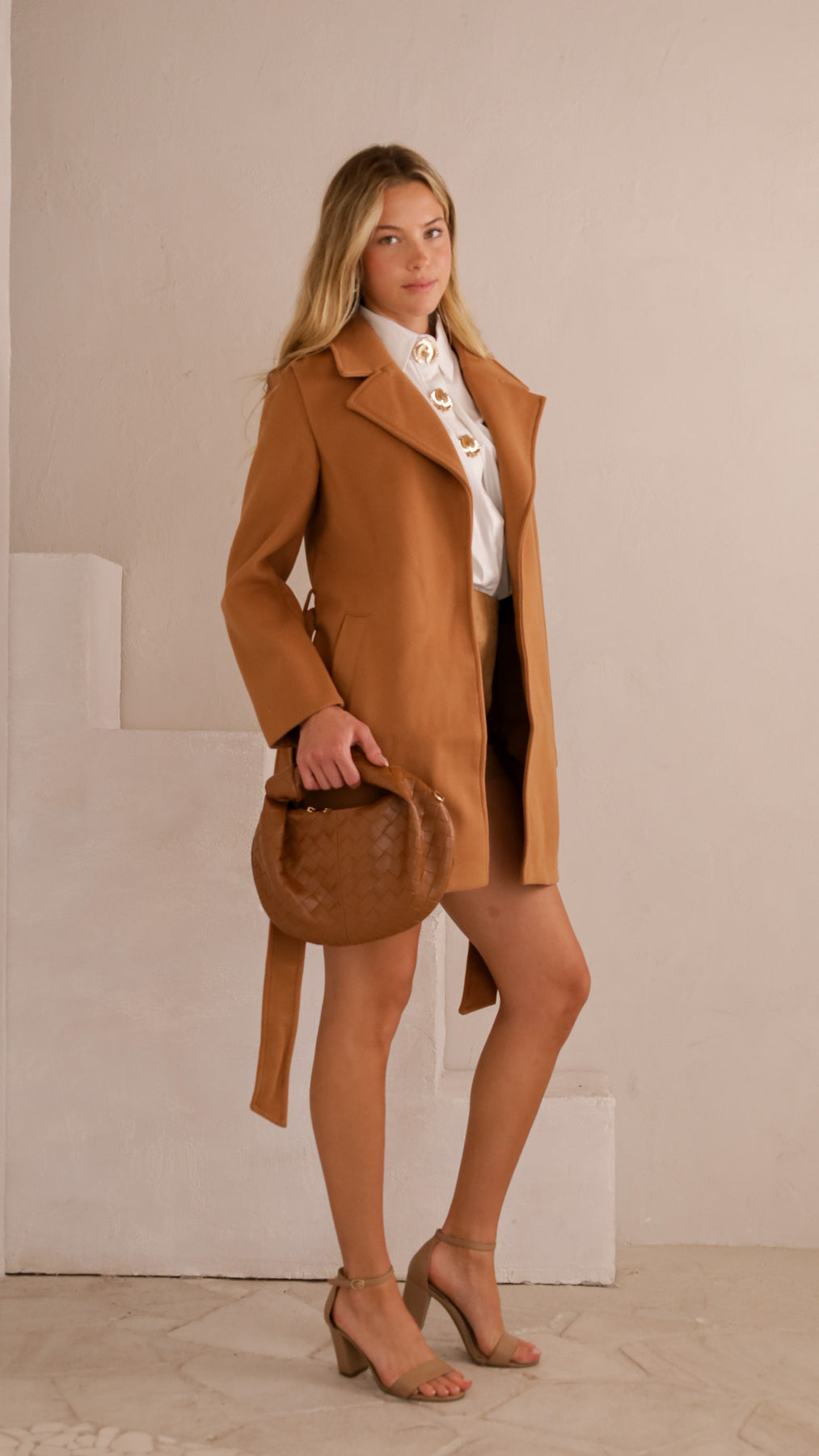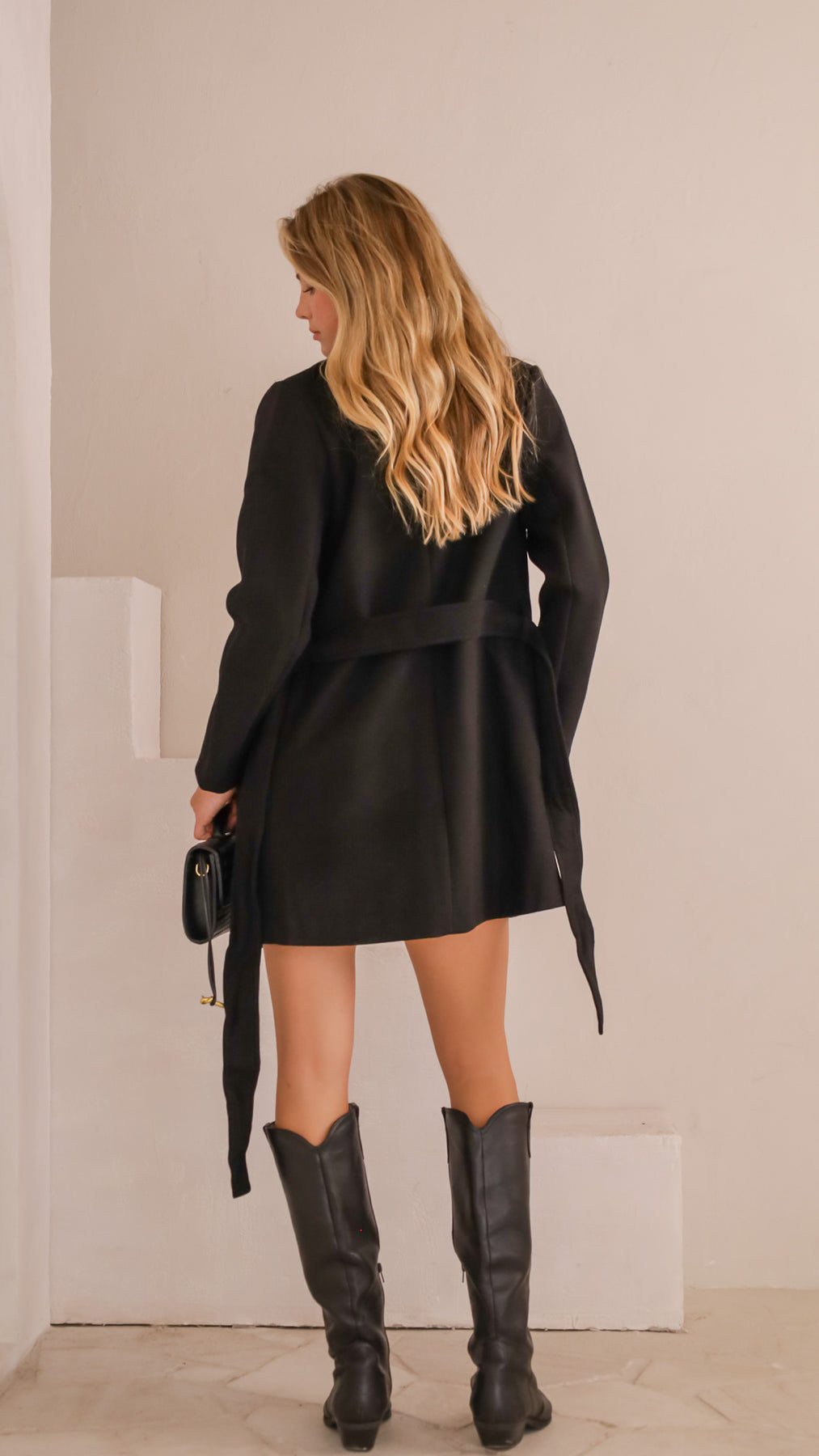 Style: Longline wrap jacket with a self-tie waist belt and tailored lapels