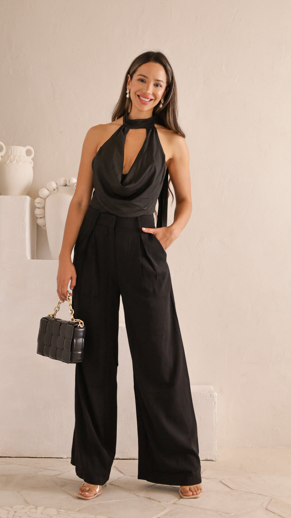 Style: Sleeveless wide-leg jumpsuit with a draped design