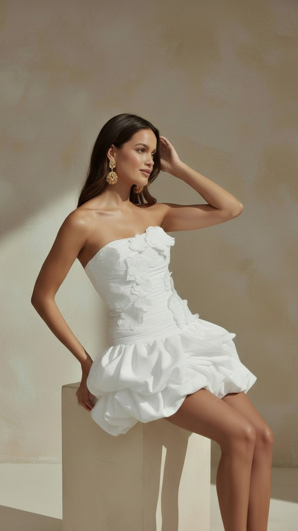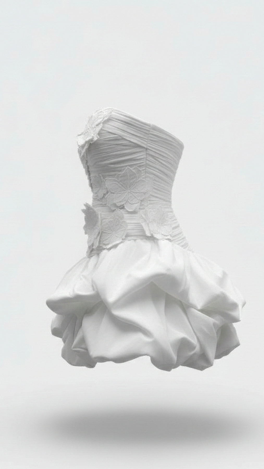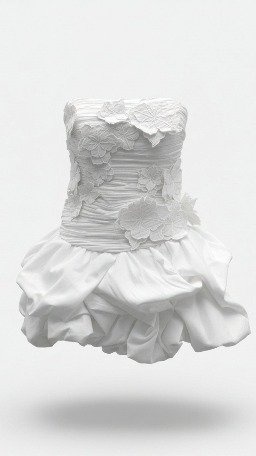 Style: Strapless mini dress with rushed bodice and dramatic ruffle skirt