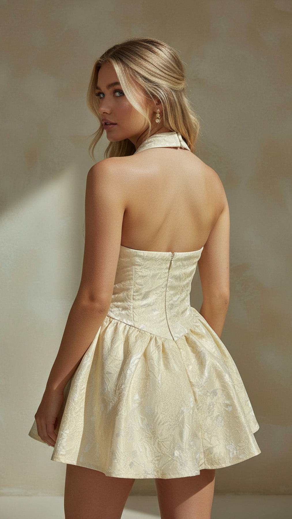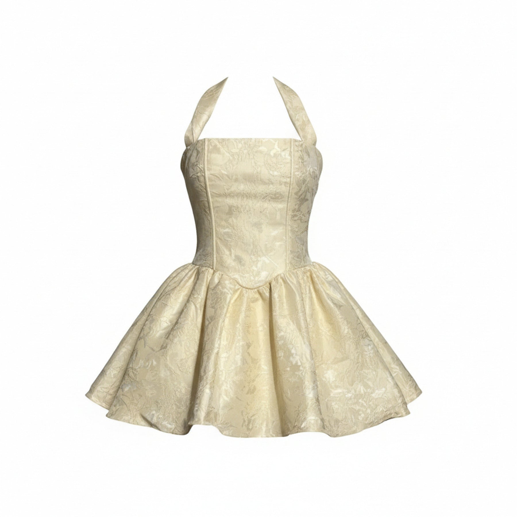 Style: Sleeveless halter mini dress with structured bodice and flared skirt