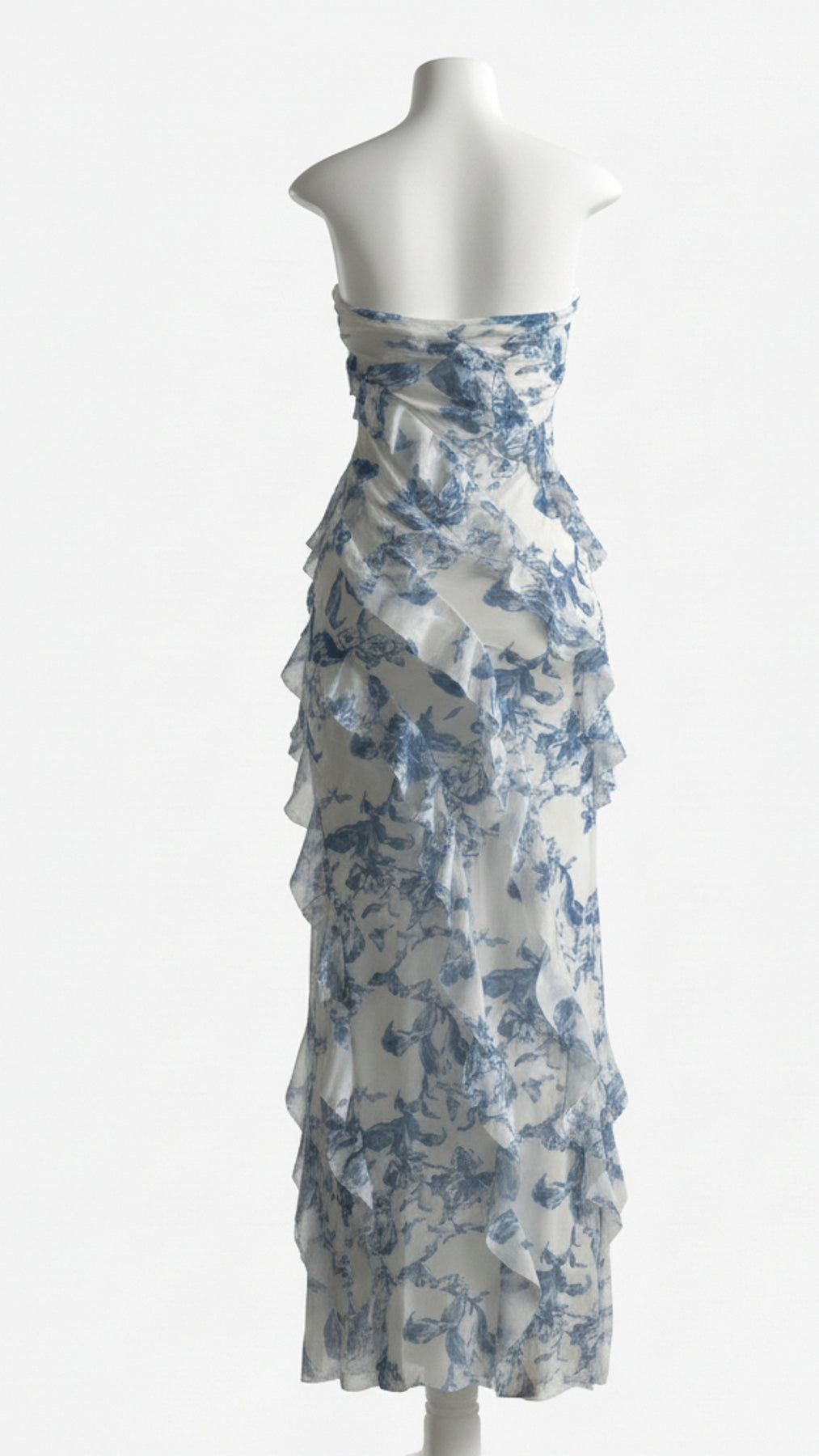Style: Strapless maxi dress with cascading ruffle details and an asymmetrical hem