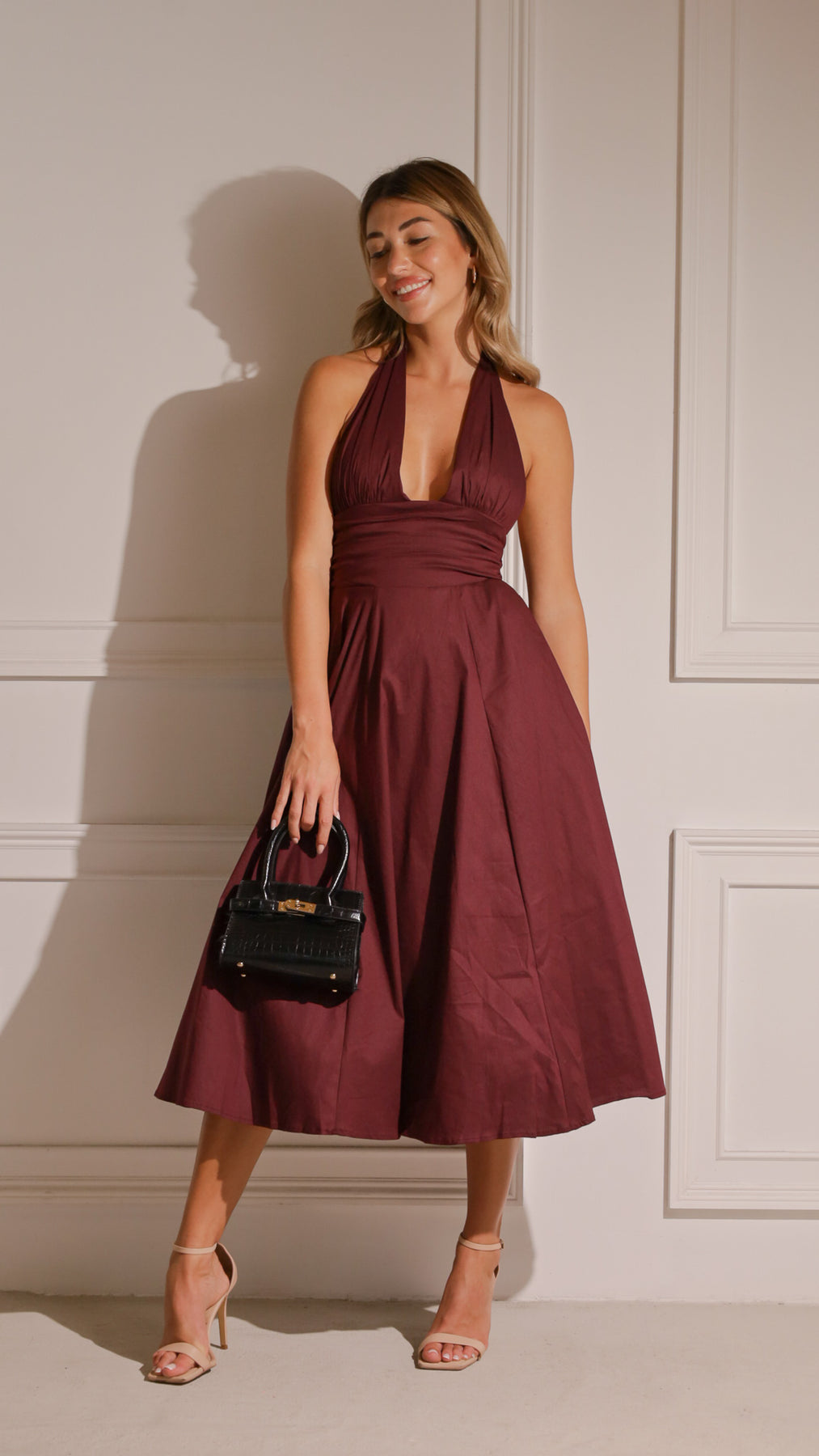 Neckline: Plunging halter neckline with gathered bodice