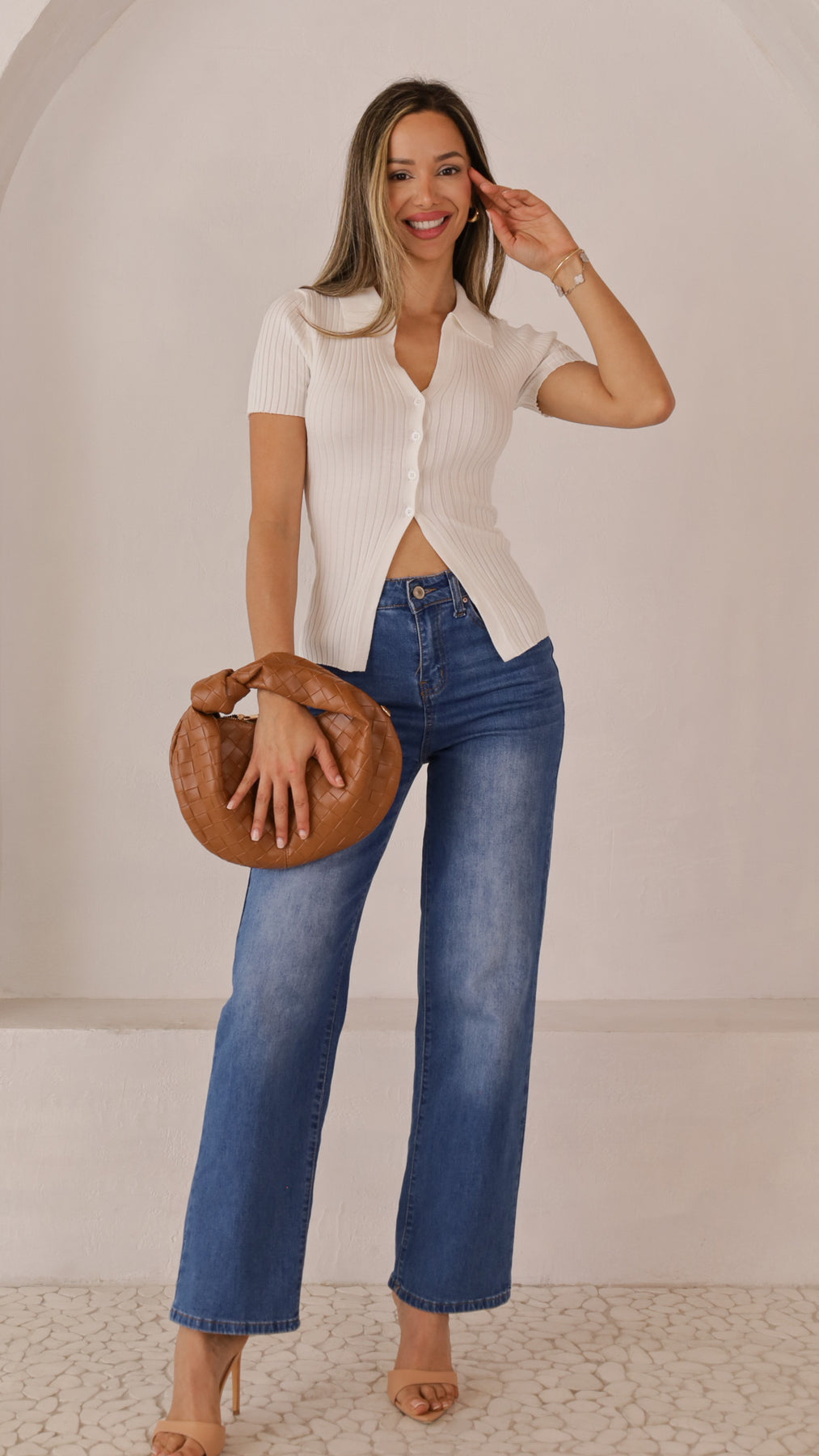 Style: Short sleeve ribbed knit top with button-front detail and split hem