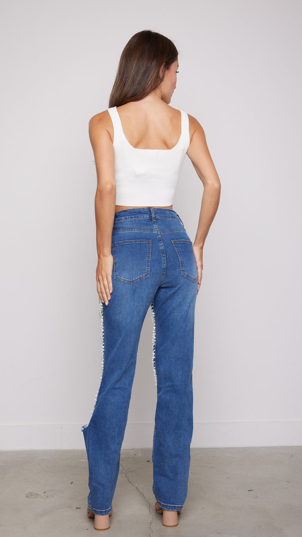 Elevate your casual style with our Elena Pants adorned with Pearls, a perfect fusion of edgy and sophisticated. The strategically placed rips add a touch of modern flair, while the delicate pearls lend a luxurious and unexpected charm. These jeans effortlessly combine street style with elegance, making them a versatile and chic addition to your wardrobe for a fashion-forward edge.