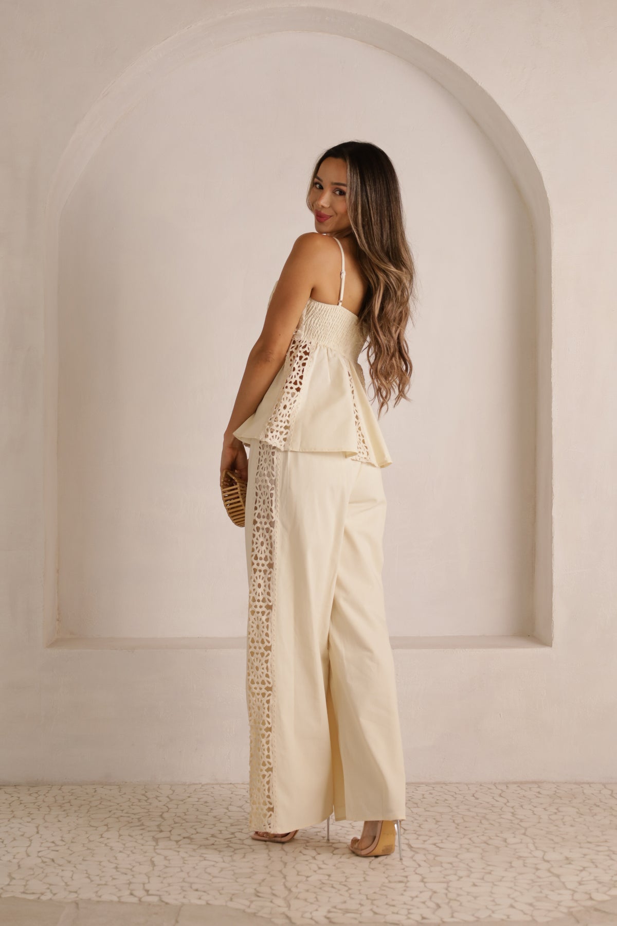 Style: High-waisted palazzo pants with crochet side panel detailing