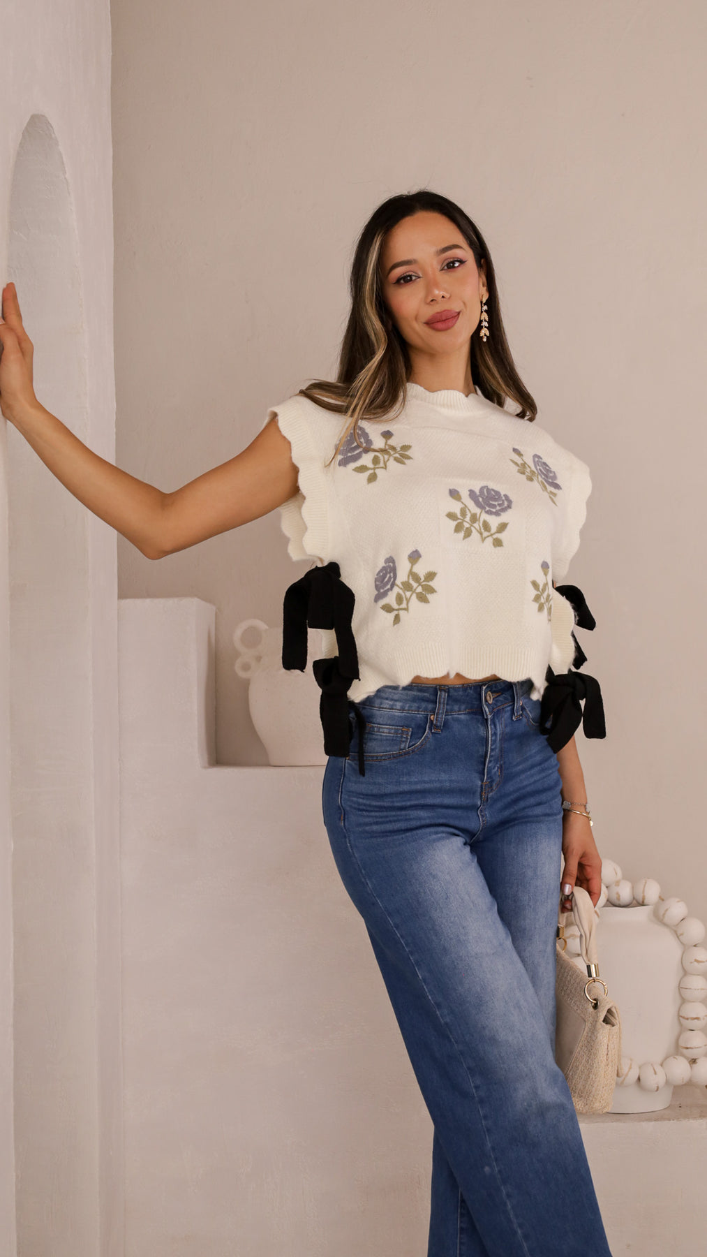 Style: Sleeveless knit top with floral embroidery and scalloped edges