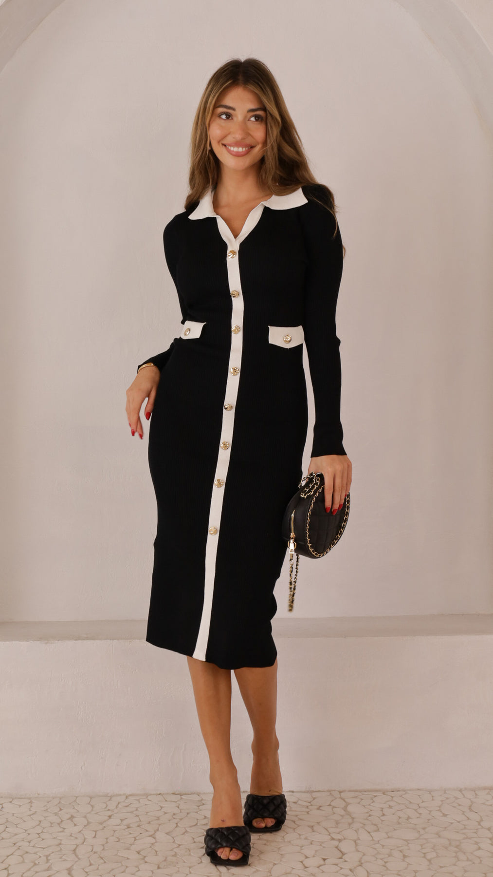 Style: Ribbed midi silhouette with contrast trim and button-front design
