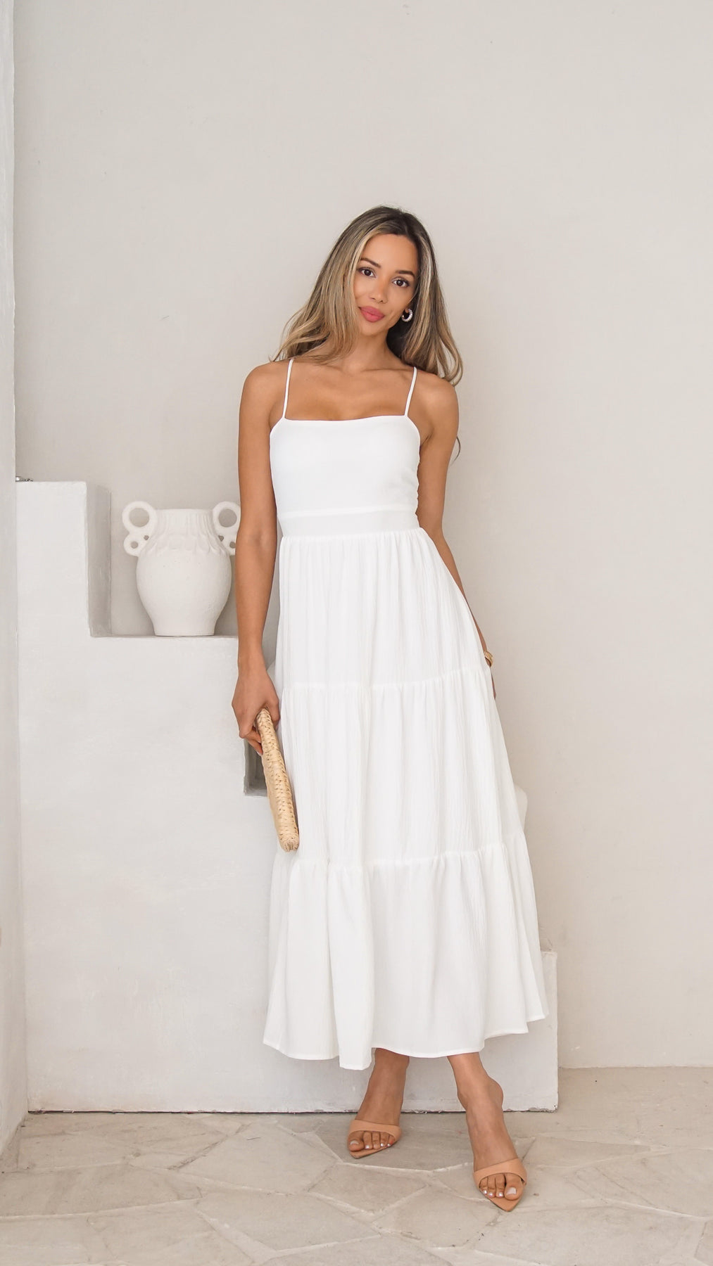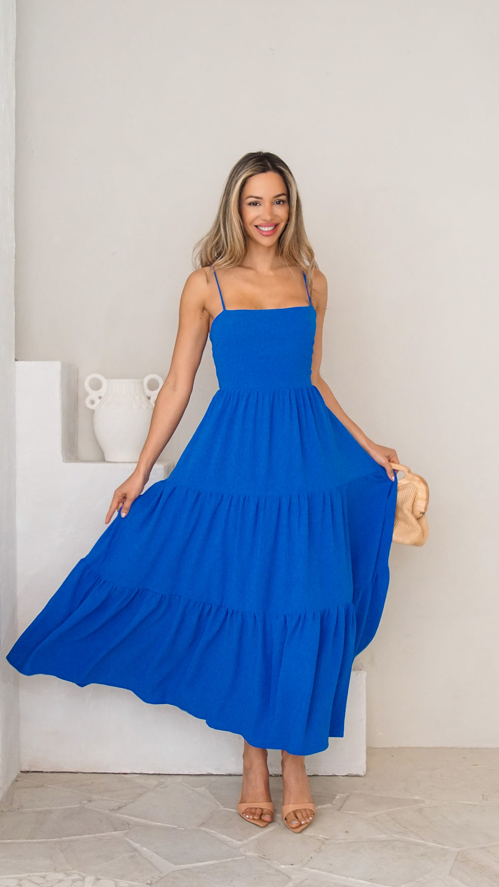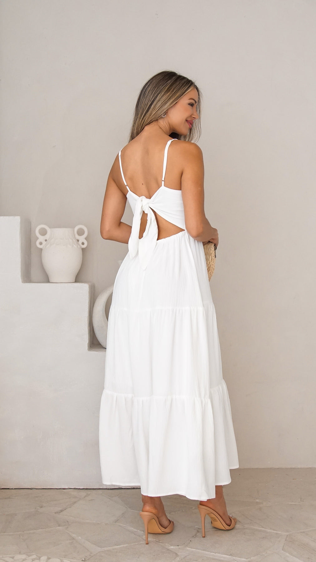 Style: Tiered maxi dress with open back tie detail.