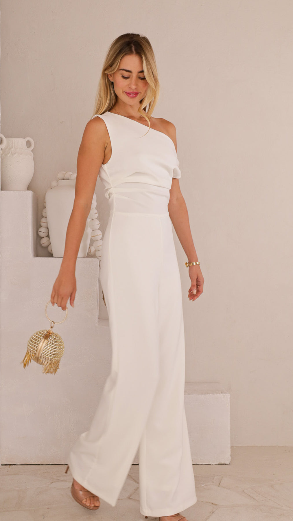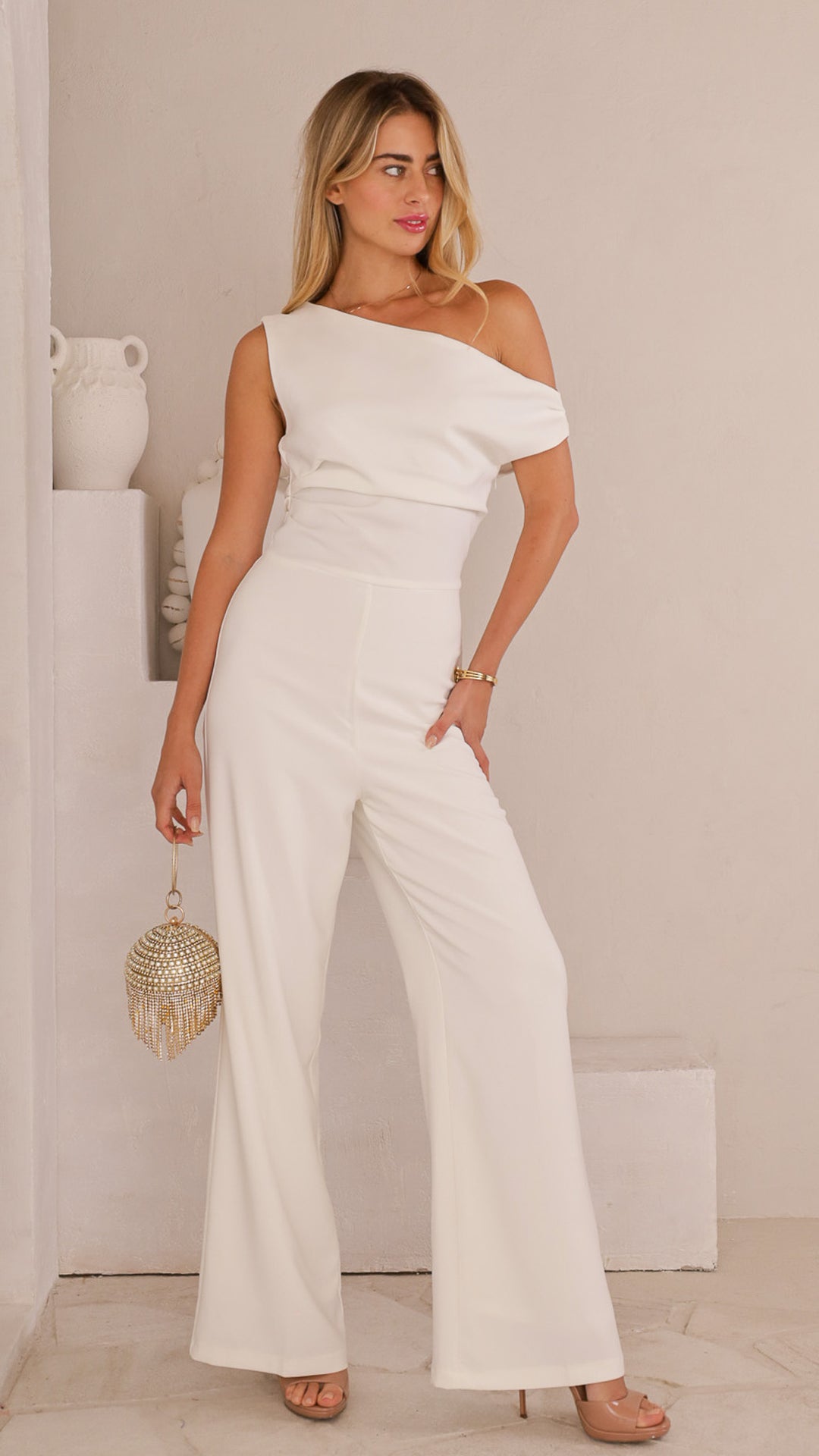 Style: One-shoulder, full-length jumpsuit with wide legs