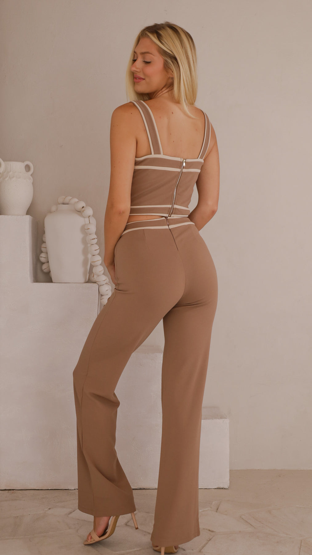 Style: Sleeveless crop top with button details and high-waisted wide-leg pants