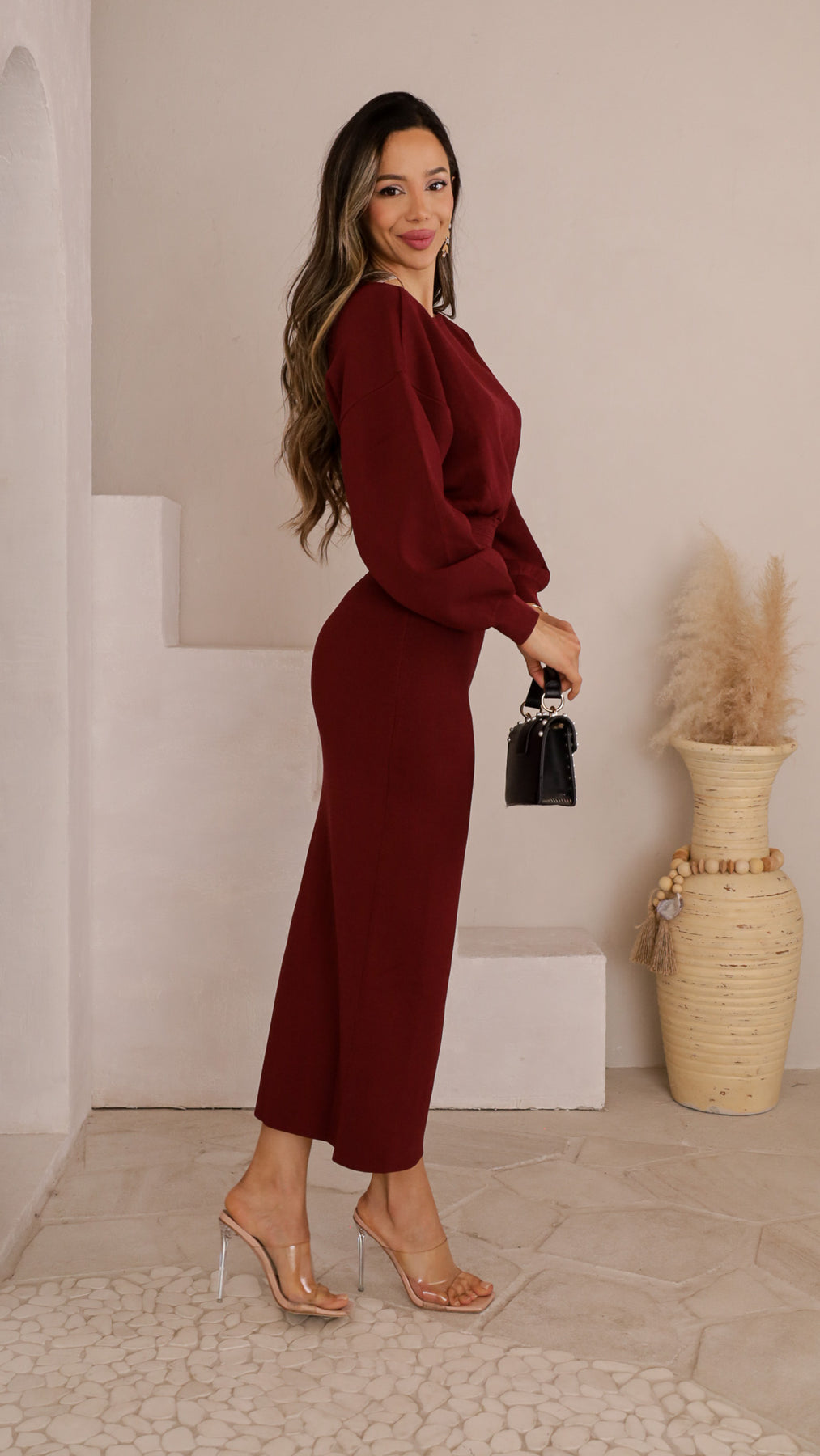 Style: Long-sleeve knit midi dress with a blouson bodice and fitted waist