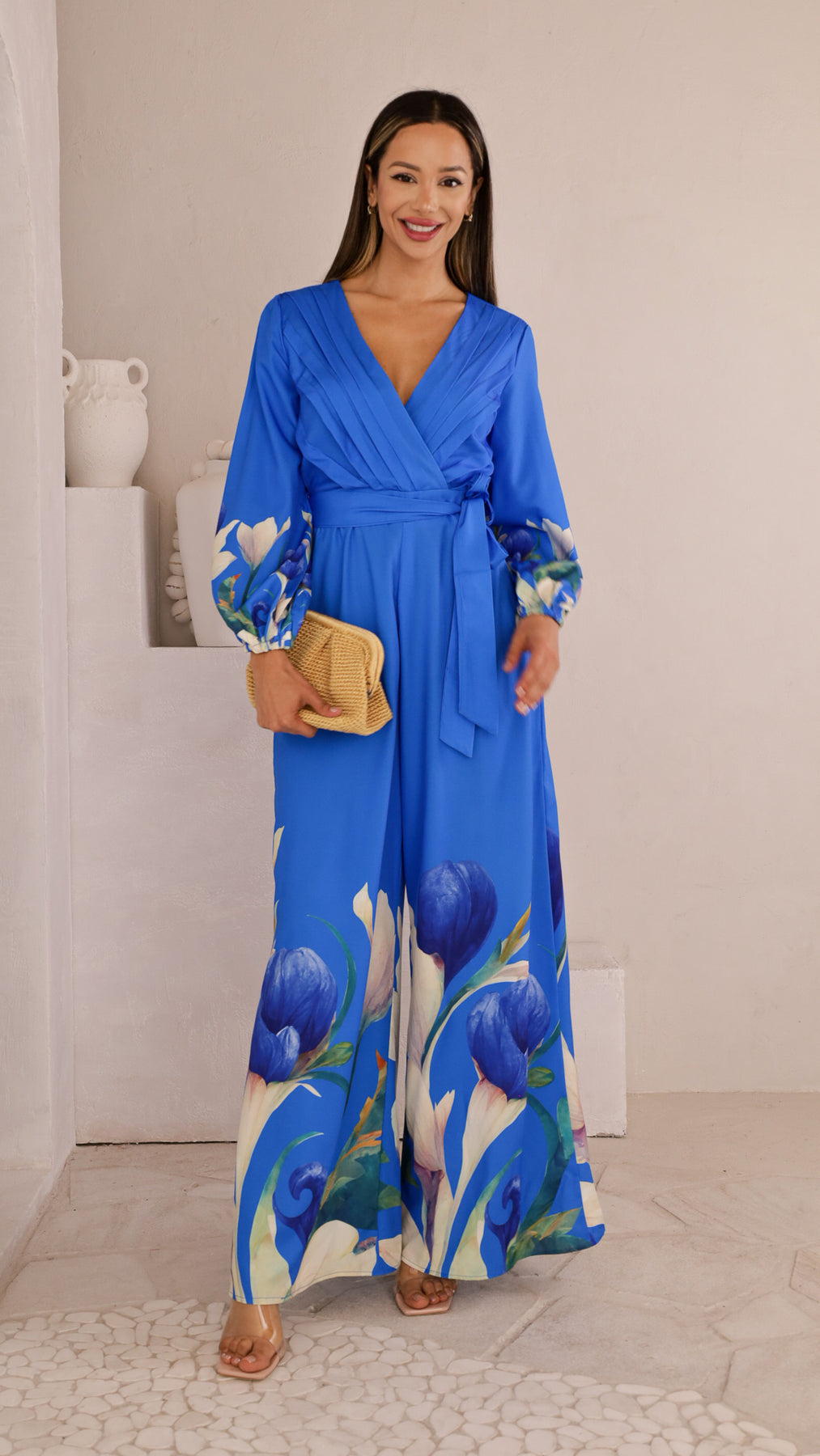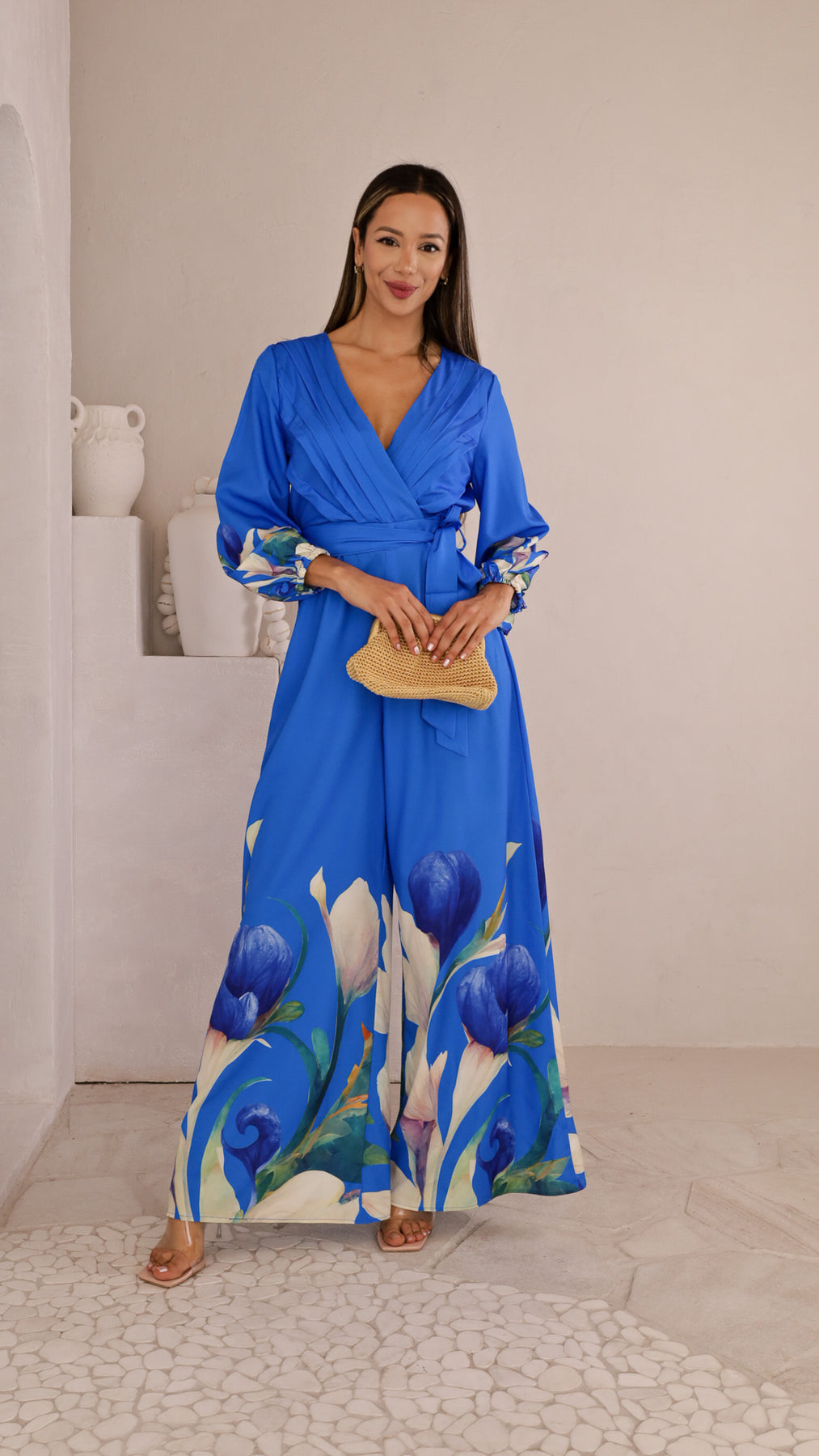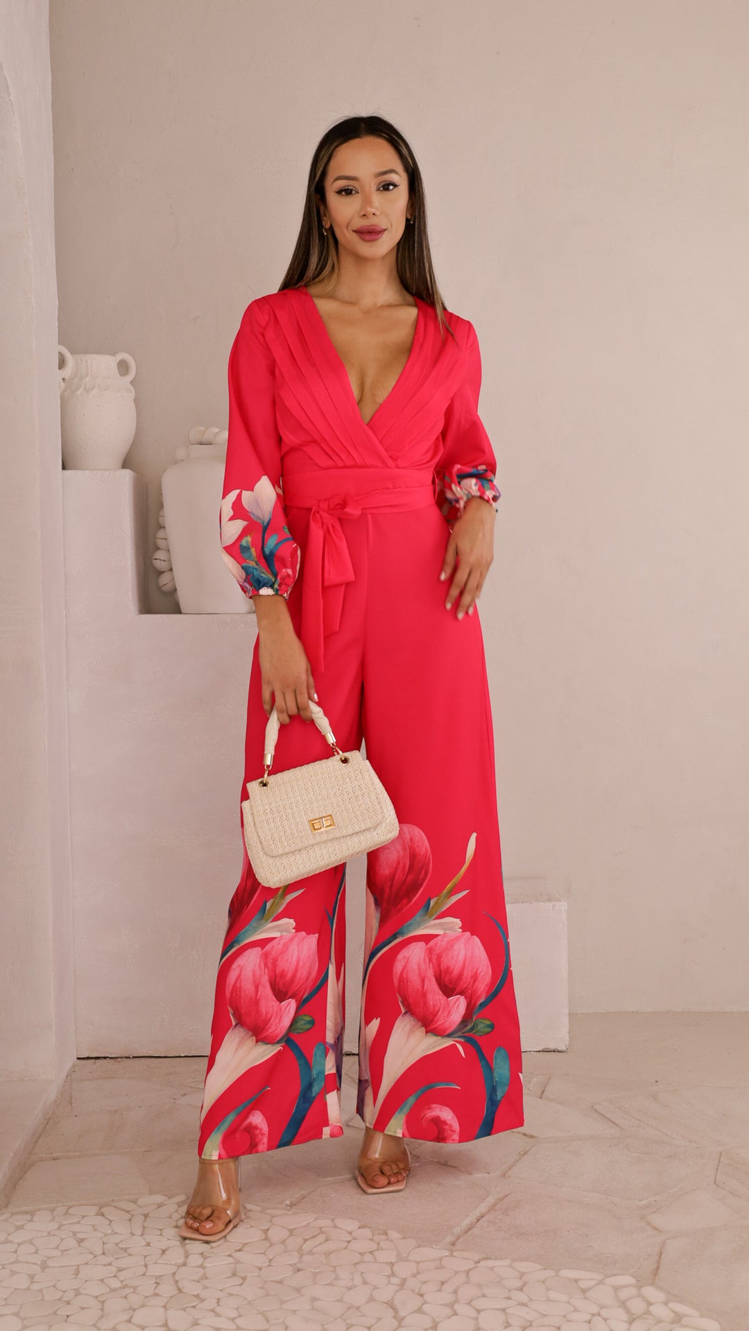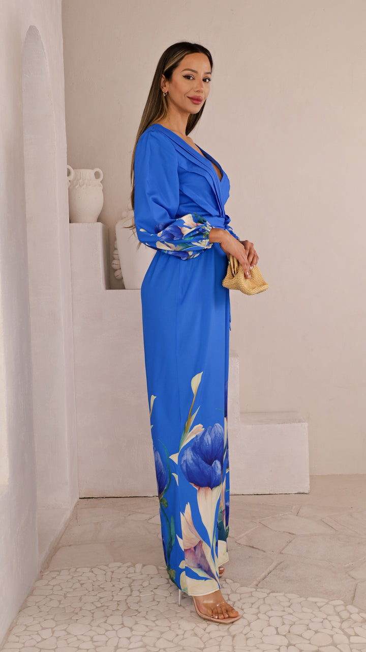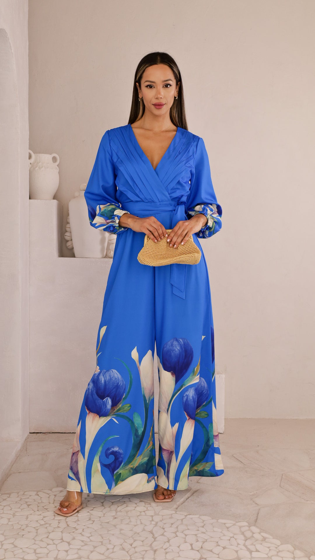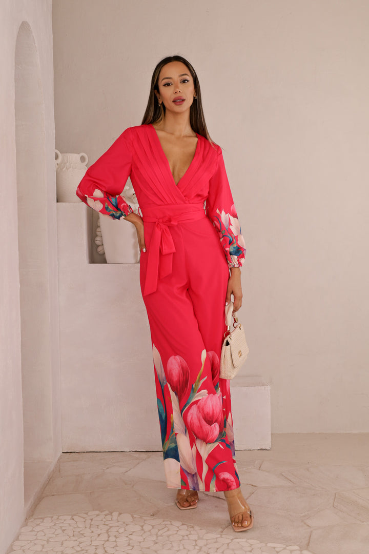 Long-sleeve wide-leg jumpsuit with self-tie waist