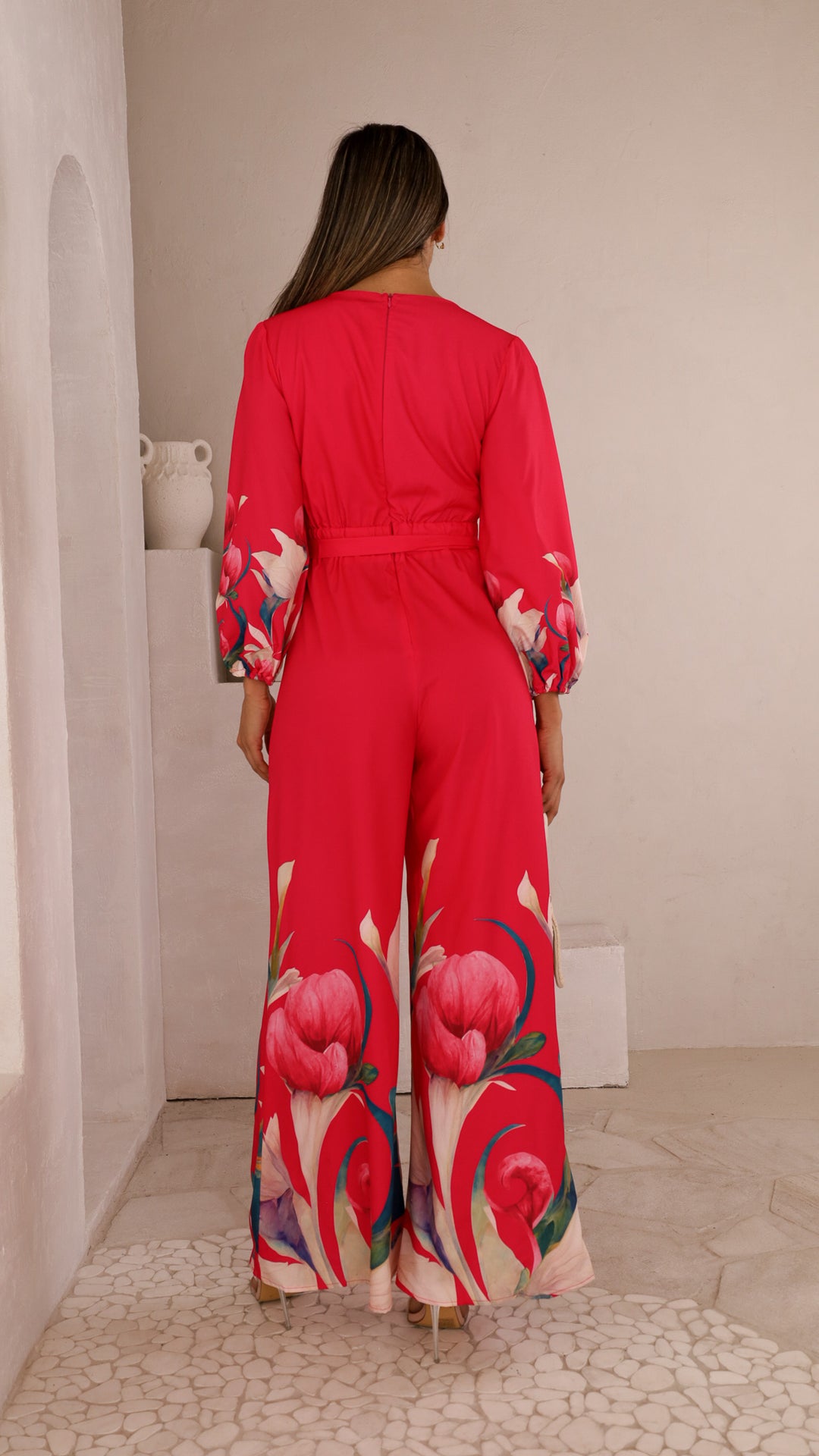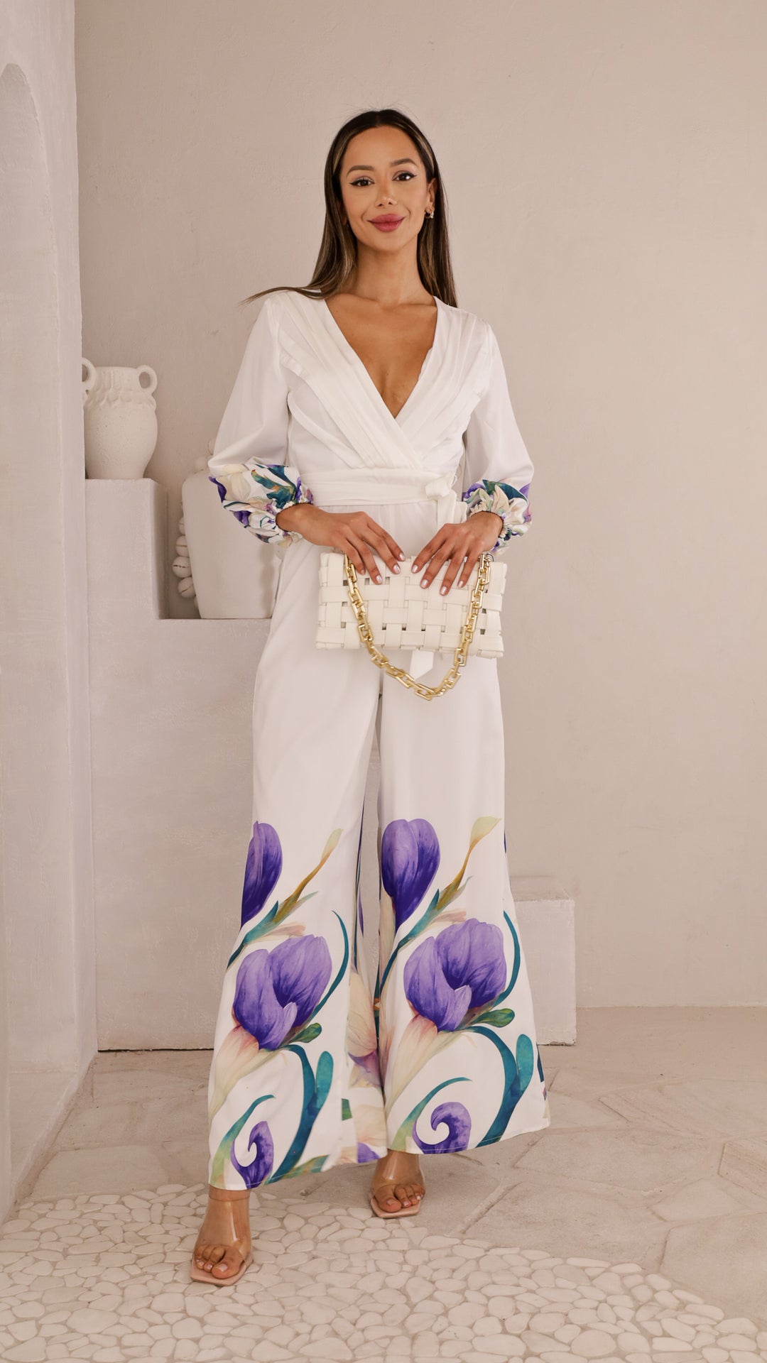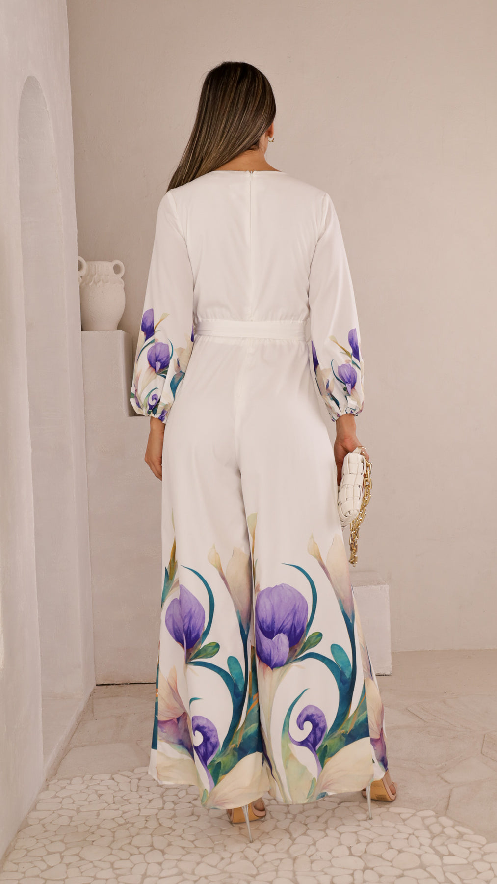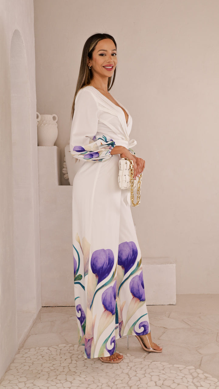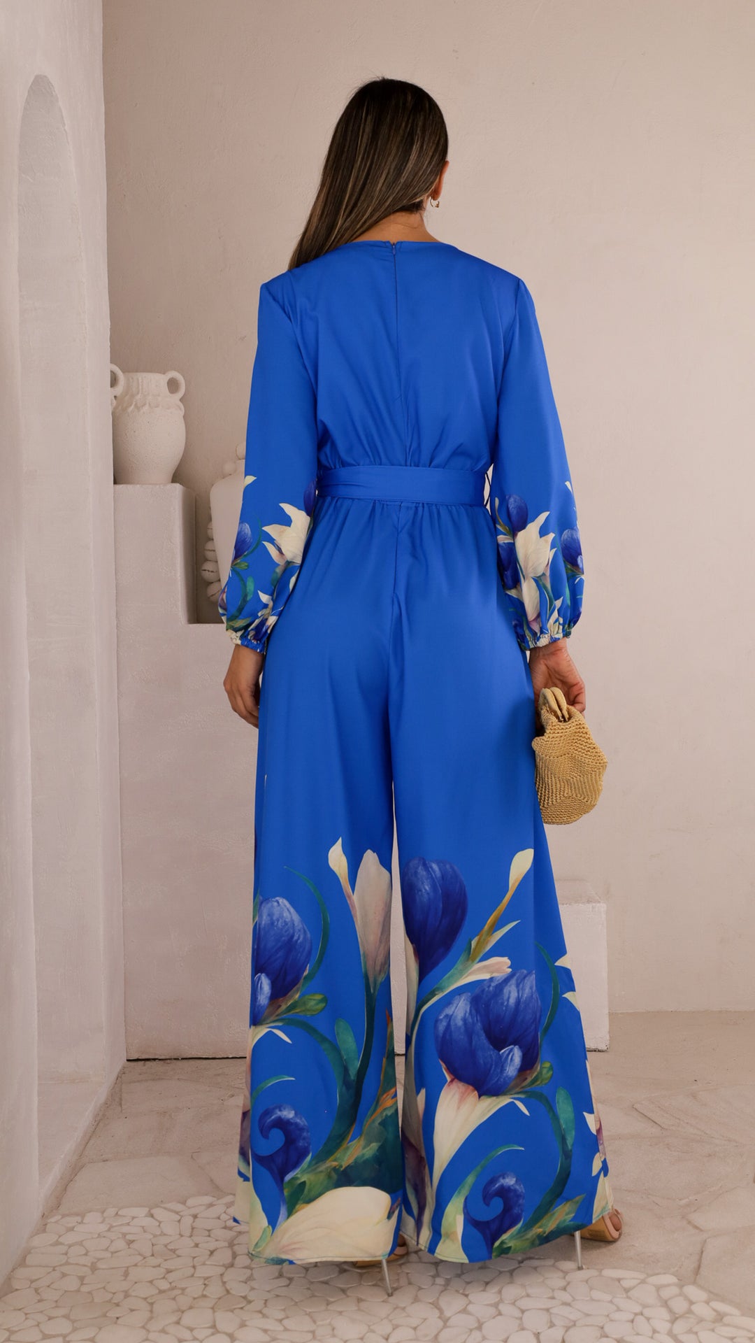 Long-sleeve wide-leg jumpsuit with self-tie waist