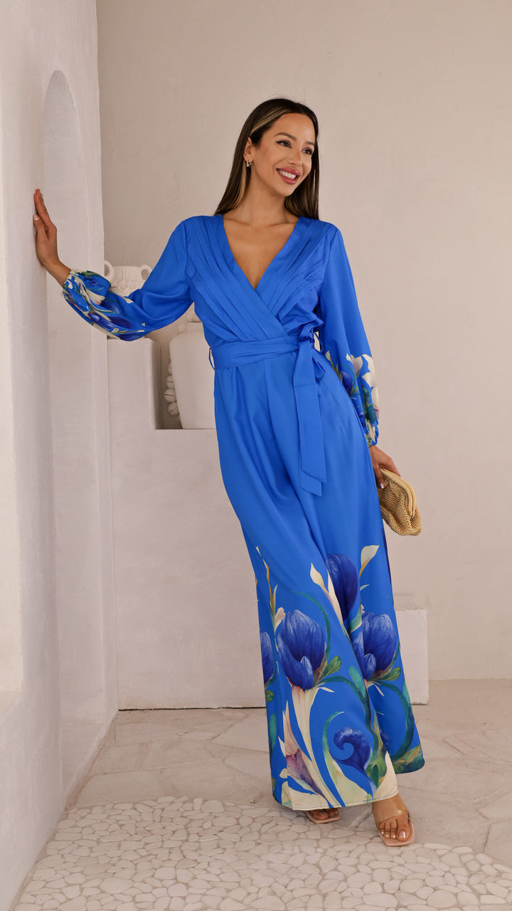 Deep surplice V-neck with pleated detail Flowy silhouette with defined waist and gathered cuffs