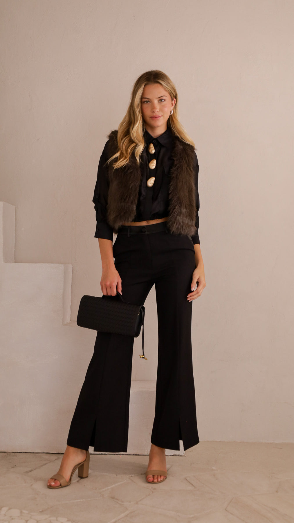 Style: Soft faux fur vest with a cropped, open-front design